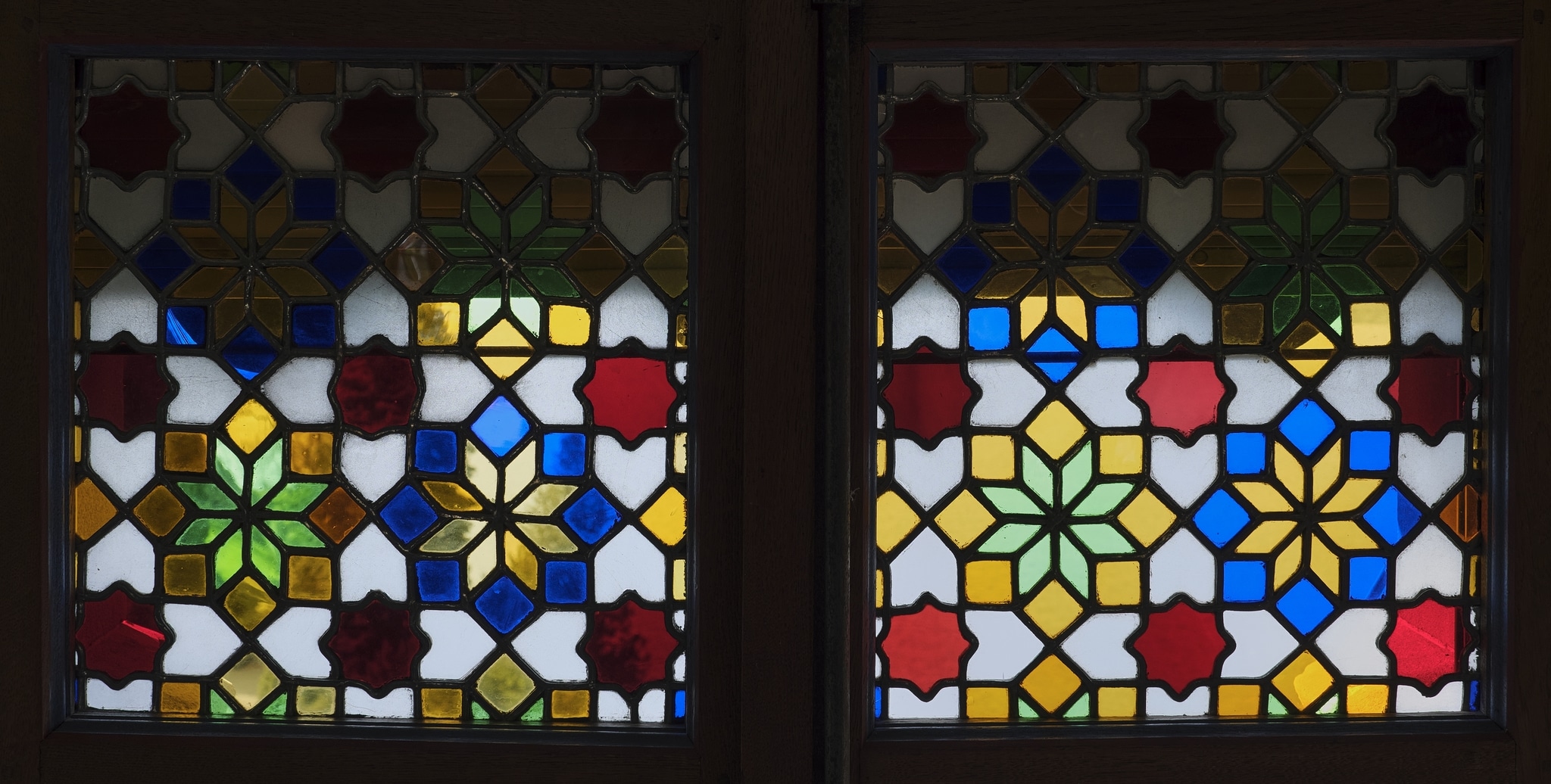The stained glass panels show a slightly modified version of the flower and star ornamentation documented in several of the stucco and glass windows studied from Egypt (see for instance IG_12, IG_38, IG_167, IG_171, IG_186). In contrast to these windows, the eight-petalled flower set into the star has been replaced by a smaller eight-pointed star.