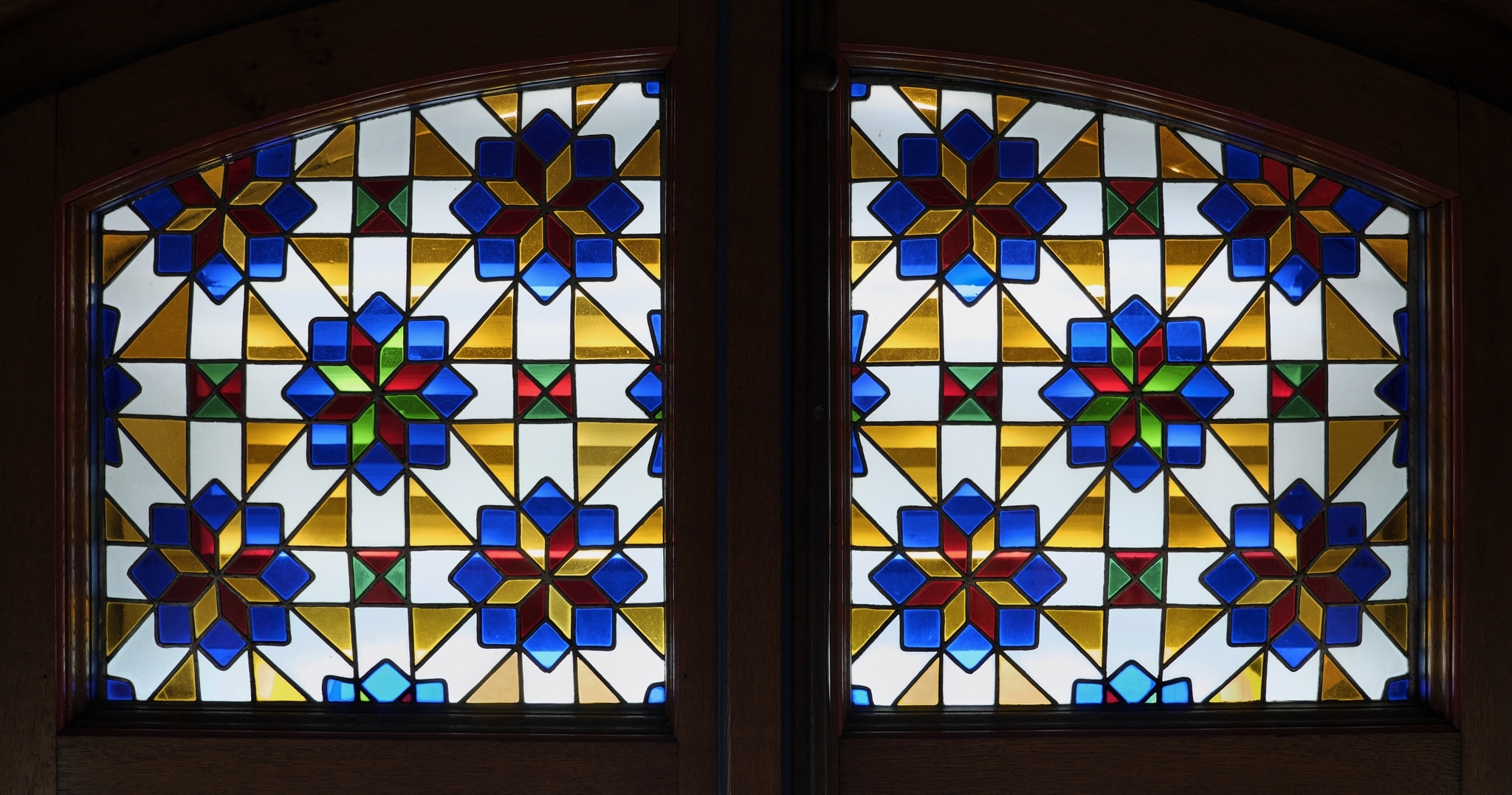 The two stained-glass panels in the upper part of the wooden cross-window show symmetrically arranged star ornamentation composed of eight-pointed stars, each inscribed within a slightly larger eight-pointed star in blue. Four of the inner stars combine yellow and red glass, whereas the middle one is made of green and red glass. Interlacing vertical, horizontal, and diagonal elements in colourless glass with a satin finish form a regular geometric network and setting for the five stars. The intersections of the network are marked by squares in green and red.