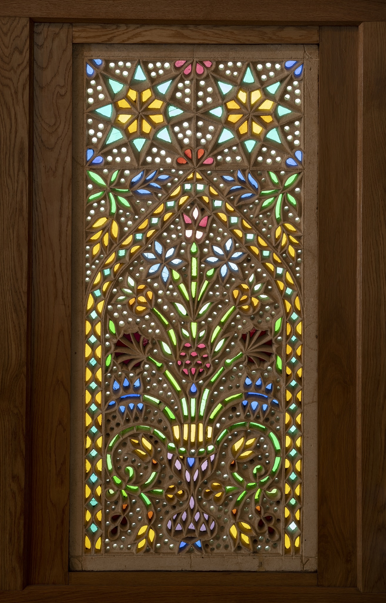 The flower-and-vase motif of this stucco and glass window is a late version of one of the standard motifs of qamariyya widespread in Egypt during the Ottoman period. The way in which the two lowest flowers with their curved stems are depicted differs from most of the examples of this type of window studied. A comparable, but less elaborate example is the Cairene window held at the Victoria and Albert Museum in London (MES.LOST.22). We have, however, no direct comparison for the flowers in the spandrels, which are much more elaborate than the floral motifs of most of the other windows.