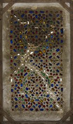 The latticework was carved into a rectangular stucco panel and inlaid with colourless and coloured pieces of glass.