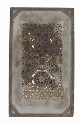 Latticework carved into a rectangular stucco panel and inlaid with colourless and coloured pieces of glass.