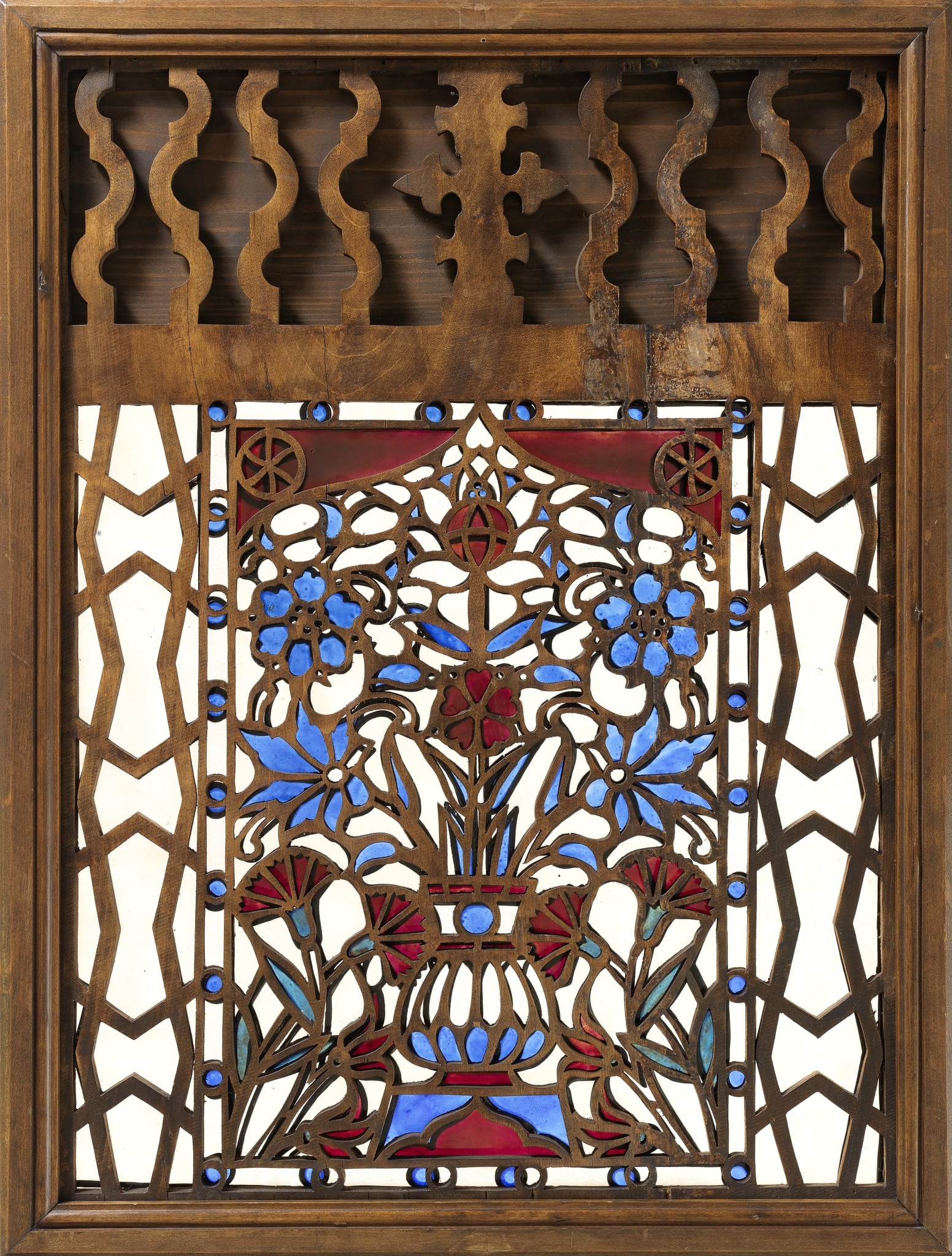 This wooden replica of a rectangular stucco and glass window with a motif of flowers in a vase is incorporated in a wooden mashrabiyya. The flowers are arranged symmetrically along the central axis. The representation of the flowers is more naturalistic than in Islamic stucco and glass windows with the same motif. Despite the naturalistic rendering of the flowers, it is not possible to determine the species. The vase sits on a low base (a small table or stool) and is flanked by tulips and carnations. The flowers-in-a-vase motif is framed by an ogee arch. Stylizised six-petalled flowers adorn the spandrels above the arch. A rectangular double frame decorated with blue dots surrounds the entire motif.