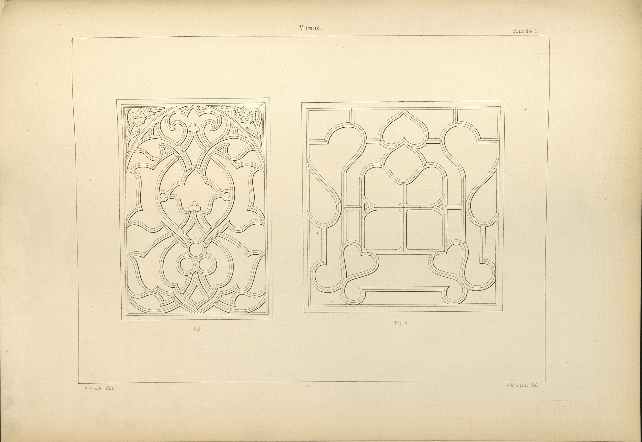 Pl. I of the part on glass windows in the ‘Observations Concerning Ottoman Ornamentation’ (‘Bemerkungen zur Osmanischen Ornamentation. Glasscheiben’ / ‘Notices sur l’ornementation ottomane. Vitraux’) in Marie de Launay’s Die Ottomanische Baukunst / L’Architecture ottomane / Uṣūl-i Miʿmāriyye-i ʿUsmaniyye, Istanbul: Imprimerie et lithographie centrales, published in 1873, is a monochrome print based on a drawing by Pietro Montani. It shows two stucco and glass windows.