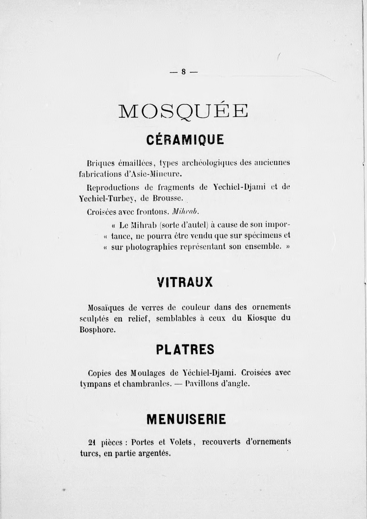 This auction catalogue is an important source for showing that after world’s fairs, architectural fragments of national pavilions, and in particular stucco and glass windows, were offered for public sale. These fragments are described in the catalogue as decorations and art materials used in the construction of the Ottoman Empire’s buildings on the Champ de Mars and attributed to the architect of the Ottoman pavilions, Léon Parvillée (‘Matériaux d’Art ayant servi à la construction des Édifices de l’Empire Ottoman au Champ-de-Mars. [Décorations de M. Léon Parvillée.]’, Baudry, 1867, p. 7). The mosque windows are described as mosaics of coloured glass in sculpted relief ornaments. Reference is further made to the very similar windows of the Pavillon du Bosphore (IG_109), another Ottoman pavilion, at the 1867 Exposition Universelle in Paris (‘Mosquée. Vitraux. Mosaïques de verres de couleur dans des ornements sculptés en relief, semblables à ceux du Kiosque du Bosphore.’ Baudry, 1867, p. 8). The stucco and glass windows on sale were documented photographically when installed in the Ottoman Mosque at the Exposition Universelle (IG_108); their fate after the auction is unknown.