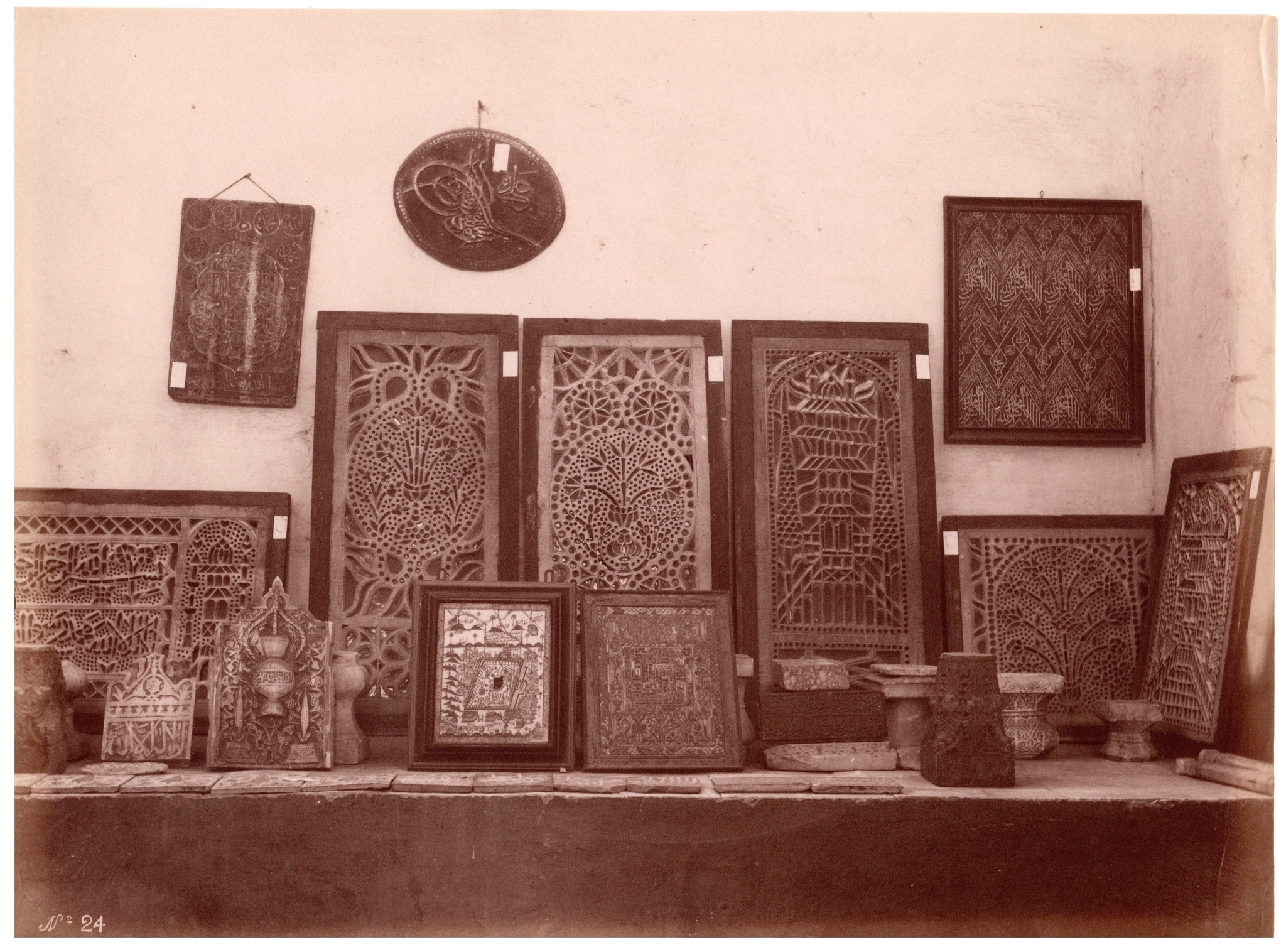 This monochrome photograph shows different objects exhibited at the Museum of Arab Art in the Al-Hakim Mosque in Cairo. It is part of an album entiteled Musée Arabe à la Mosquée El-Hakem, au Caire with 25 photographs by Pascal Sébah. Photograph number 24 is described in the caption as general view of marbles, faïence, and glass windows (‘Vue générale de marbres, fayences et vitraux’). Most prominently placed of all the objects exhibited are six stucco and glass windows. Three of them show the motif of flowers in a vase, two within medallions and one under a round arch. The other three windows show mosques with minarets and courtyard, combining a frontal and a bird’s eye view. Two of them include cypresses flanking the architecture. The other one is a window with several sections. While only one section depicts architecture, the other sections are embellished with Arabic inscriptions.
