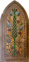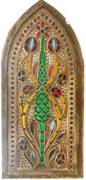 Latticework carved into a rectangular stucco panel and inlaid with pieces of colourless and coloured sheet glass. The latticework is held in a wooden frame.