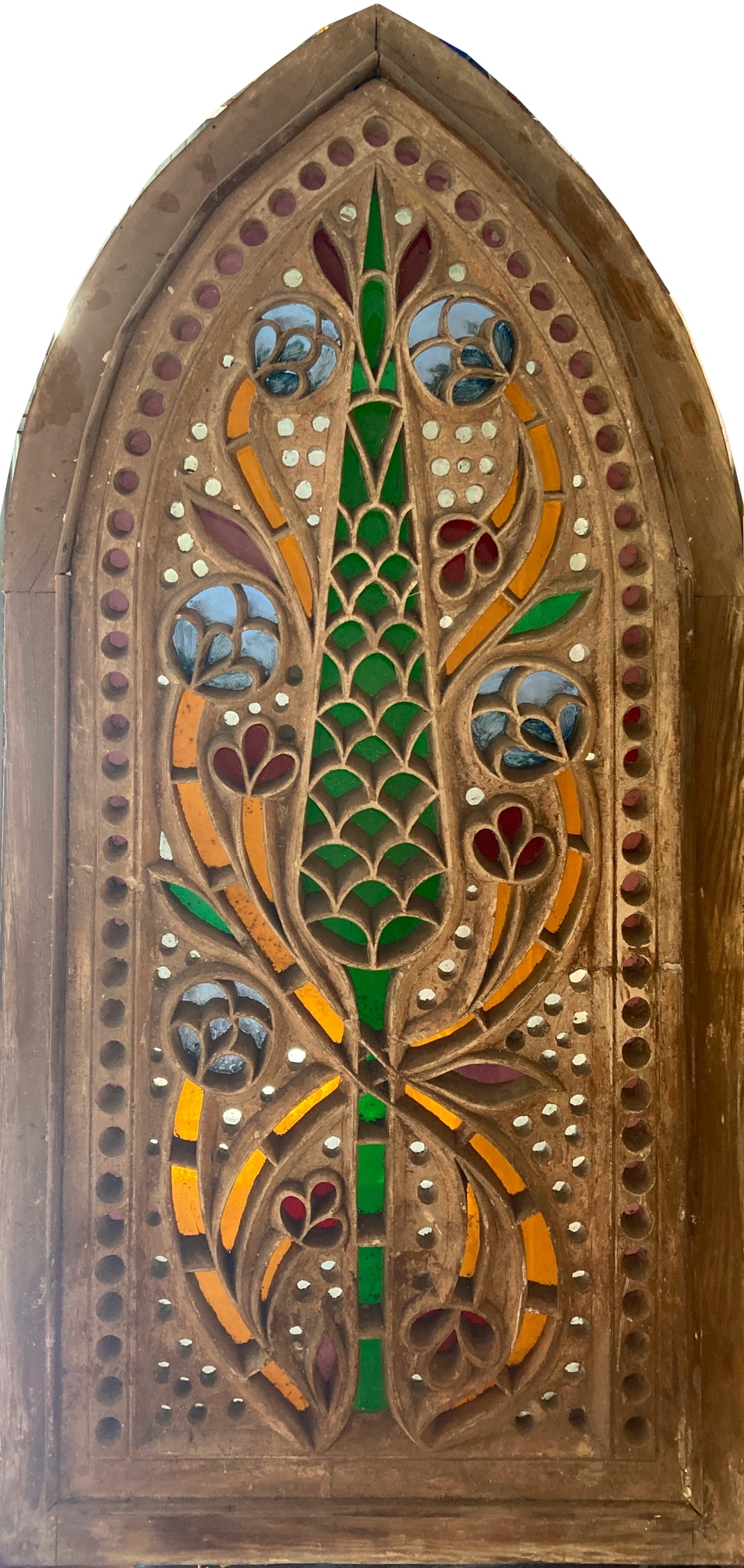 Pointed-arch stucco and glass window with a green cypress tree in the centre. The scale-like pattern usually used to represent the foliage of the cypress is replaced in the upper part by geometric ornament, and the top of the tree is flanked by two leaves. Two flower tendrils with stylized roses and three-petalled flowers spring from the foot of the tree and cross at the upper part of the cypress’s trunk. Two more rose tendrils spring from the side of the foliage, at mid-height. The cypress tree and tendrils are framed by a pointed arch and surrounded by a perforated background, which is slightly recessed.