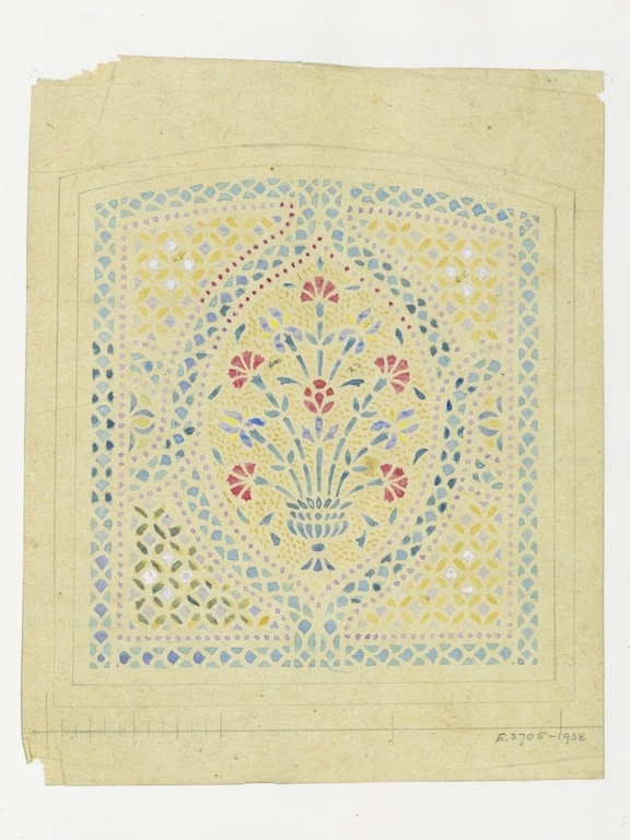 This design by the British architect James William Wild (1814–1892) served as a model for the production of a stucco and glass window in ‘Arab style’ for the Oriental Courts of the South Kensington Museum in London. The London-based firm James Powell & Sons executed the window after Wild’s draft. Records indicate that Wild was not paid for his Oriental Court Arab window until eleven years after the original commission (Physick, 1982, p. 82; Thomas, 2013, pp. 54–56; Giese, 2021, p. 97).