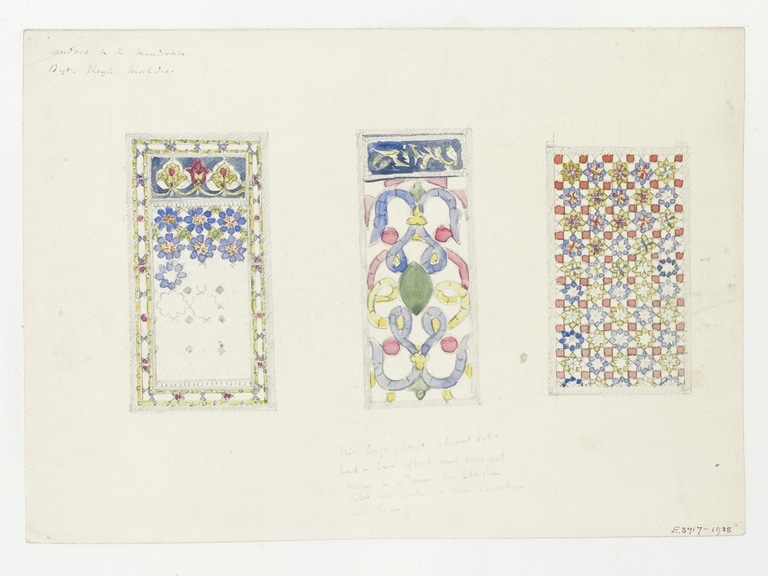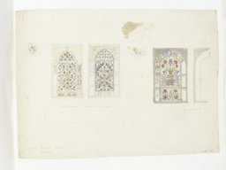 This pencil and watercolour drawing by the British architect James William Wild (1814–1892) shows three stucco and glass windows with geometric motifs. The window on the left consists of two parts, framed by ribbon ornament: the larger lower area is ornamented with eight-pointed stars in blue and red, and above there is a rectangle with three stylized blossoms; the colours blue, red, and yellow predominate, and some smaller pieces of glass are in green. The centre window has geometric ornament, also in blue, yellow, green, and red; in the cartouche above, the artist may have attempted to trace an Arabic script in yellow. The window on the right-hand side shows delicate ornament in yellow, red, and blue, consisting of alternating yellow and blue eight-pointed stars surrounded by red squares. Wild has added pencil notes in the upper left corner of the drawing and below the central window that are barely legible.