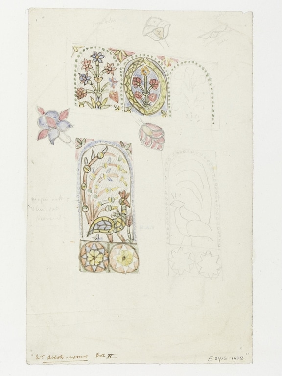 In the lower row, a rectangular window can be seen, consisting of a rectangle with two squares below. The rectangle shows the motif of a stylized peacock within an arch, and each of the two squares a star and stylized blossom within a circle. On the right-hand side, Wild has drawn a window with the same motif, but not coloured it. The two peacocks face each other in mirror image.