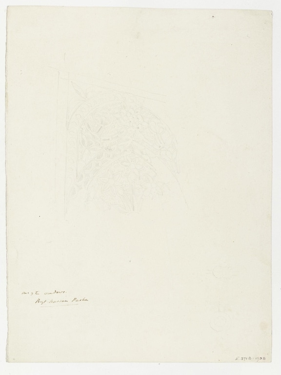 This very fine pencil drawing by the British architect James William Wild (1814–1892) shows a stucco and glass window with the motif of stylized flowers within a round arch with circular perforations.