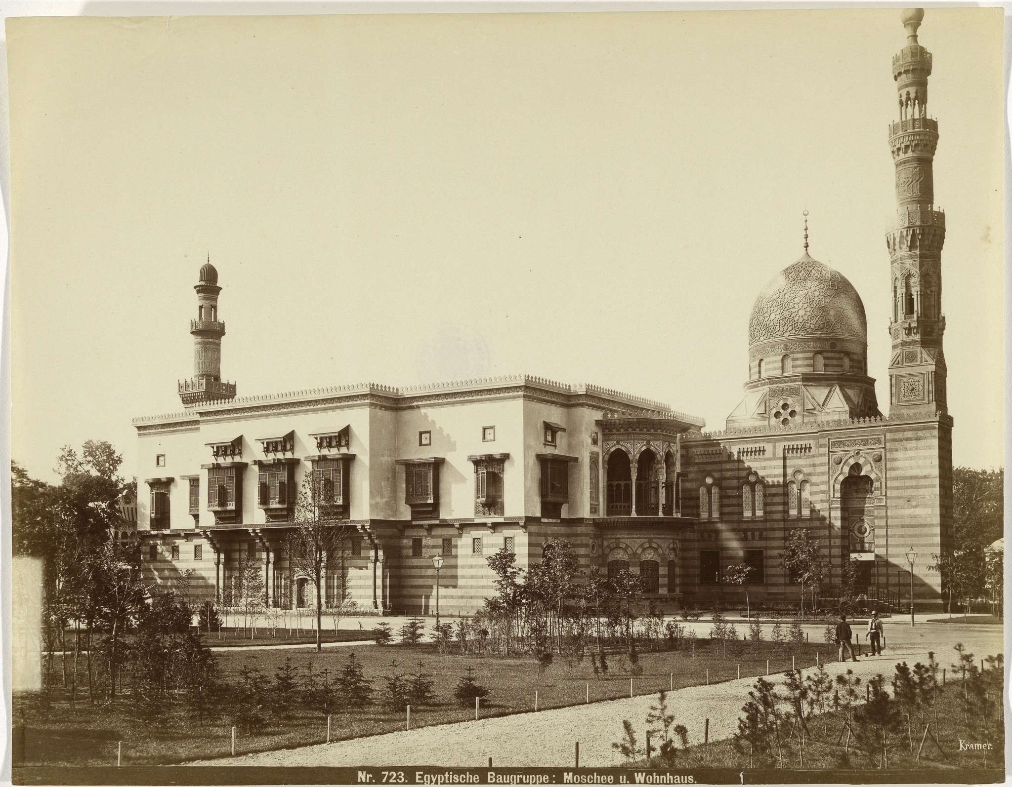 This photograph shows the mosque with dome and its minaret, as well as the Arab dwelling (Arabisches Wohnhaus) of the Egyptian building group at the Vienna world’s fair in 1873 by the architect František Schmoranz. The photograph demonstrates that the stucco and glass window, employed in various shapes and forms, was a central element.