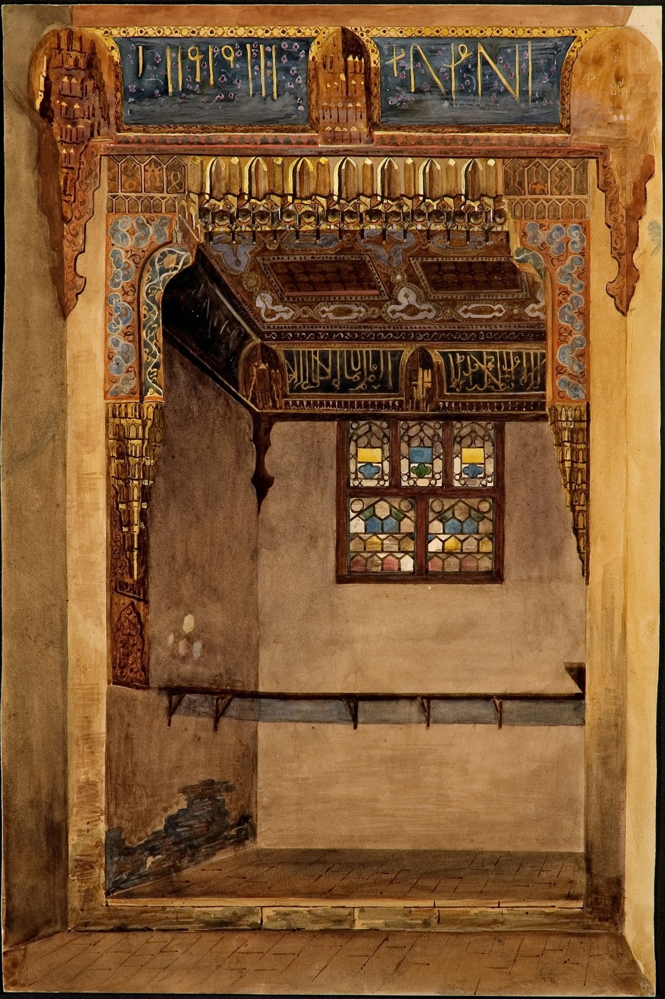 This pencil and watercolour drawing made by the Bernese architect and draughtsman Theodor Zeerleder (1820–1868) depicts an iwan in an interior in Cairo with stucco and glass windows (Stiftung Schloss Oberhofen, 2015, p. 55, cat. no. 6; Bäbler/Bätschmann, 2006, p. 123, fig. 51). Two larger rectangular windows can be seen in the lower row and three smaller rectangular windows in the upper row. All the windows are enclosed in a wooden frame. Their large glass surfaces are predominantly transparent, but there are also some coloured pieces of glass in blue, yellow, and red.