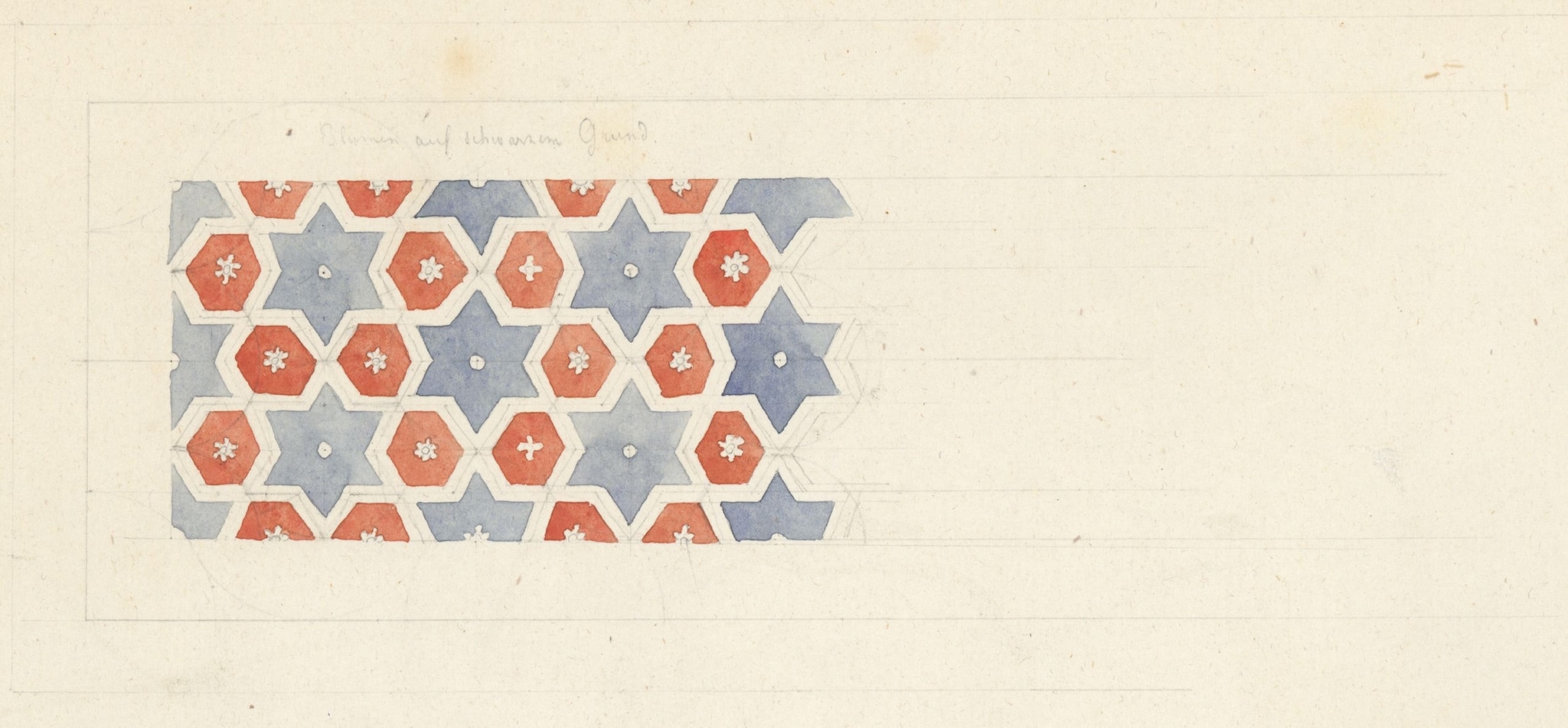 This is a pencil and watercolour study of part of a stucco and glass window with the motif of six-pointed stars in blue surrounded by hexagons in red. Zeerleder has added the pencil note ‘Blumen auf schwarzem Grund’ (‘flowers on a black ground’) in the central upper part of the drawing. The drawing is part of a larger corpus of artworks that he made on site in Cairo and which is today held at the Burgerbibliothek Bern in Switzerland.