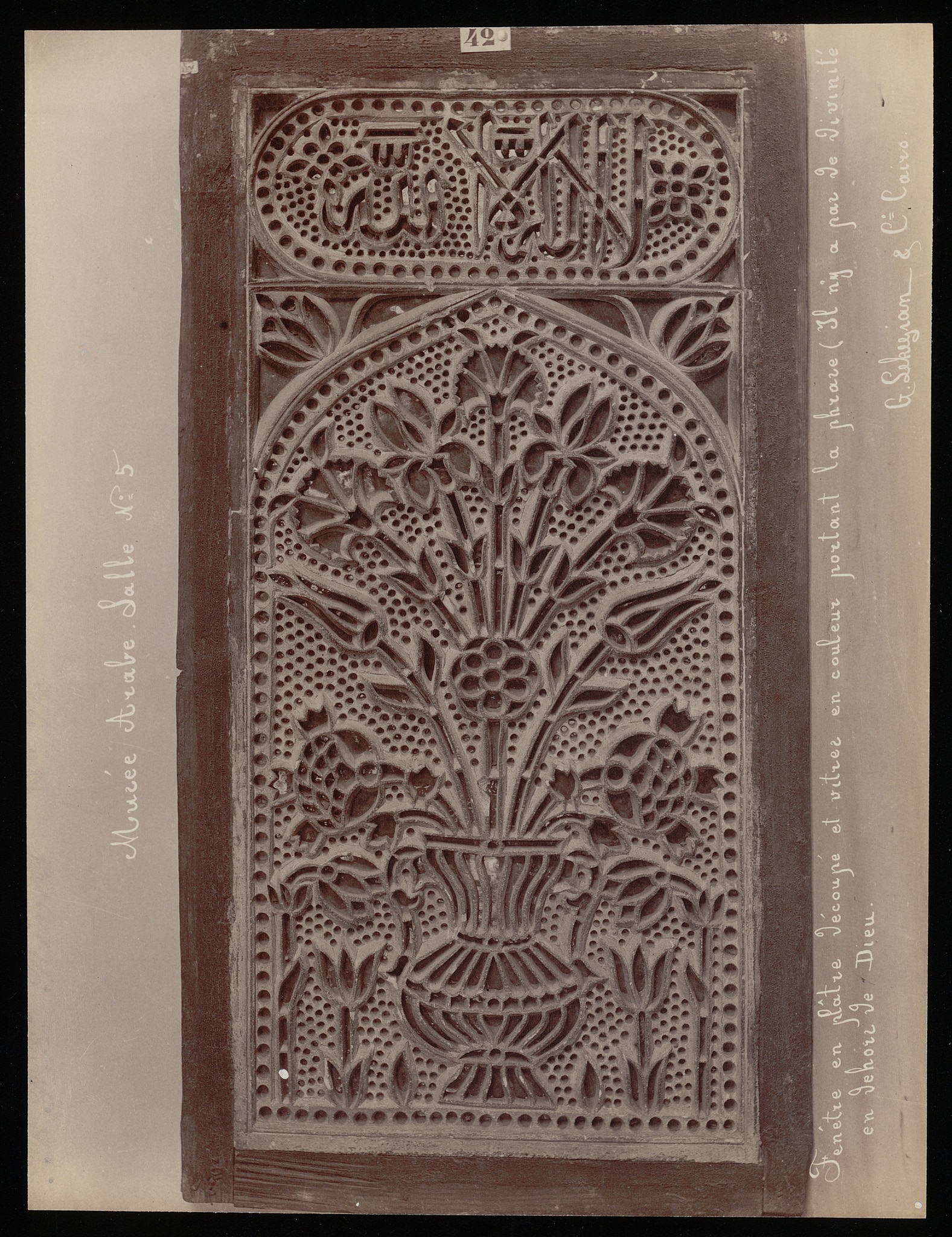 This photograph by Lekegian is part of a collection of eighteen black and white photographs (albumen prints) by the artist held in the Universitätsbibliothek Basel (‘7 (1880–1920) Objekte islamischer Kunst im Musée Arabe in Kairo / Photog. Art G. Lekegian & C.’, Cairo, 1880–1920, c.28 × 22cm, Universitätsbibliothek Basel, Nachlass Wilhelm Sarasin-His (1882–1950), NL 232: U: 7). The window with the motif of a vase of flowers can be seen in photograph number 14 and bears the inscriptions ‘Musée Arabe. Salle No. 5’ and ‘Fenêtre en plâtre découpé et vitres en couleur portant la phrase (Il n’y a pas de divinité en dehors de Dieu)’.