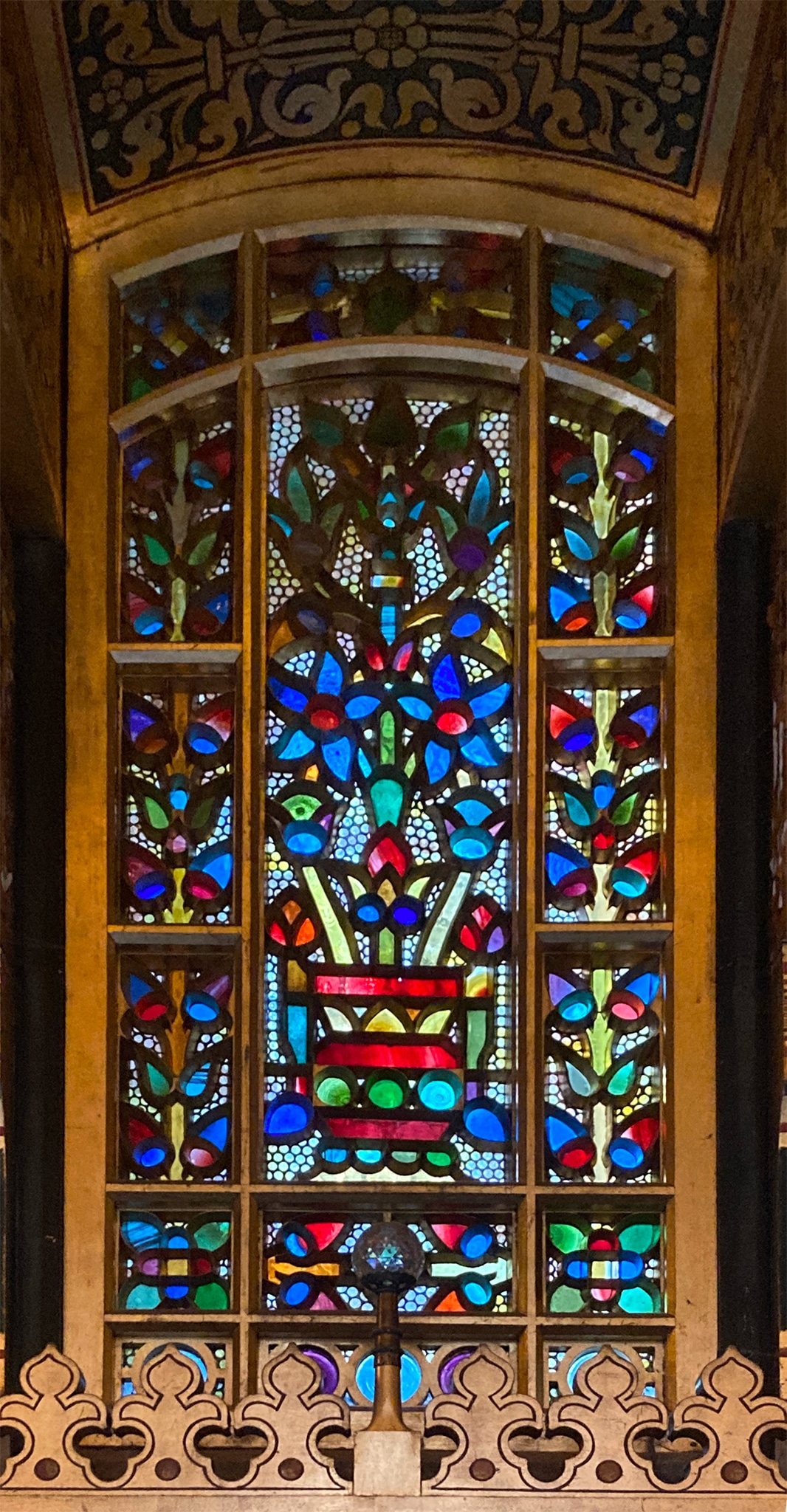 The window discussed here is one of four almost identical replicas (two pairs) installed in the upper part of the Arab Room of Cardiff Castle in Wales (IG_484–487). It forms a pair with IG_484, located at the south side of the Arab Room, which has the same composition and colour distribution. Both replicas are reminiscent of one of the standard types of qamarīya documented in the Ottoman empire. The representation of flowers in a vase is a widespread motif in Islamic decorative arts. It can be found in numerous other media, such as ceramics, wood panelling, wall paintings, and textiles, over a long period of time, and in both sacred and profane contexts.