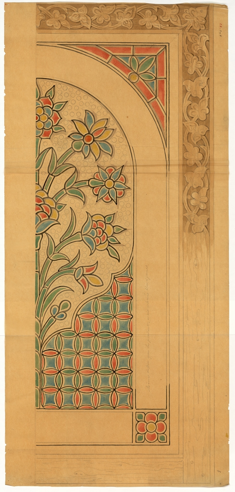 This pencil drawing, made by Émile Prisse d’Avennes (1807–1879), shows a stucco and glass window with the motif of stylized flowers (roses, carnations, lillies and tulips) within an arch, with a lattice ornament in the lower section. Prisse d’Avennes only painted the right half of this symmetrical window, which he coloured in red, yellow, and green. The window is encased in a wooden frame with stylized tendril ornament.