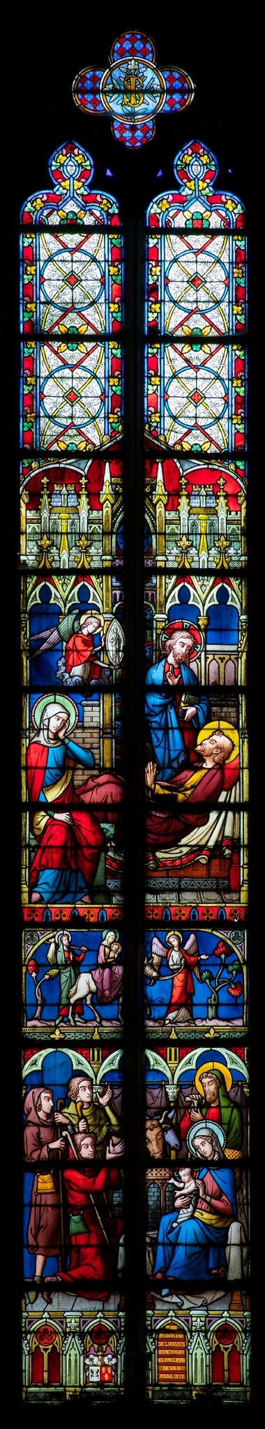 Das zweilanzettige Masswerkfenster zeigt zwei grosse sowie eine kleinere Bildszene. Zuunterst in der Sockelarchitektur im Stil der Gotik ist die Widmung des Stifters mit Wappen untergebracht. Darüber ist die Anbetung der Hirten dargestellt. Drei Hirten besuchen das Christuskind im Stall von Bethlehem, um es zu ehren. Das in Windeln gewickelte Kind sitzt auf dem Schoss seiner Mutter. Hinter Mutter und Kind stehen Joseph sowie der Ochse und der Esel. Oberhalb dieser Szene ist in einem schmalen Streifen auf blauem Grund die Flucht nach Ägypten gezeigt: Maria sitzt mit dem Kind auf dem Esel, der von einem Engel geführt wird. Joseph folgt mit einem Bündel auf der Schulter nach. Die zweite grössere Bildszene ist dem Tod Josephs gewidmet. Joseph liegt mit gefalteten Händen auf dem Bett, zu seinen Füssen sitzt Maria, während Jesus Christus mit Buch und zum Segen erhobener Hand an Josephs Seite steht. Ein über Maria schwebender Engel hält ein Abbild Josephs in einer Mandorla in den Händen. Den Hintergrund bildet eine Architektur mit Fialen und Wimpergen. Das oberste Fünftel des Fensters ist mit geometrischen Ornamenten, Grisaillemalerei und einer farbigen Rahmung mit Blatt- und Blütenmotiven geschmückt. Im Vierpass, der die Lanzetten bekrönt, sind weisse Lilien und das Monogramm Josephs gezeigt.