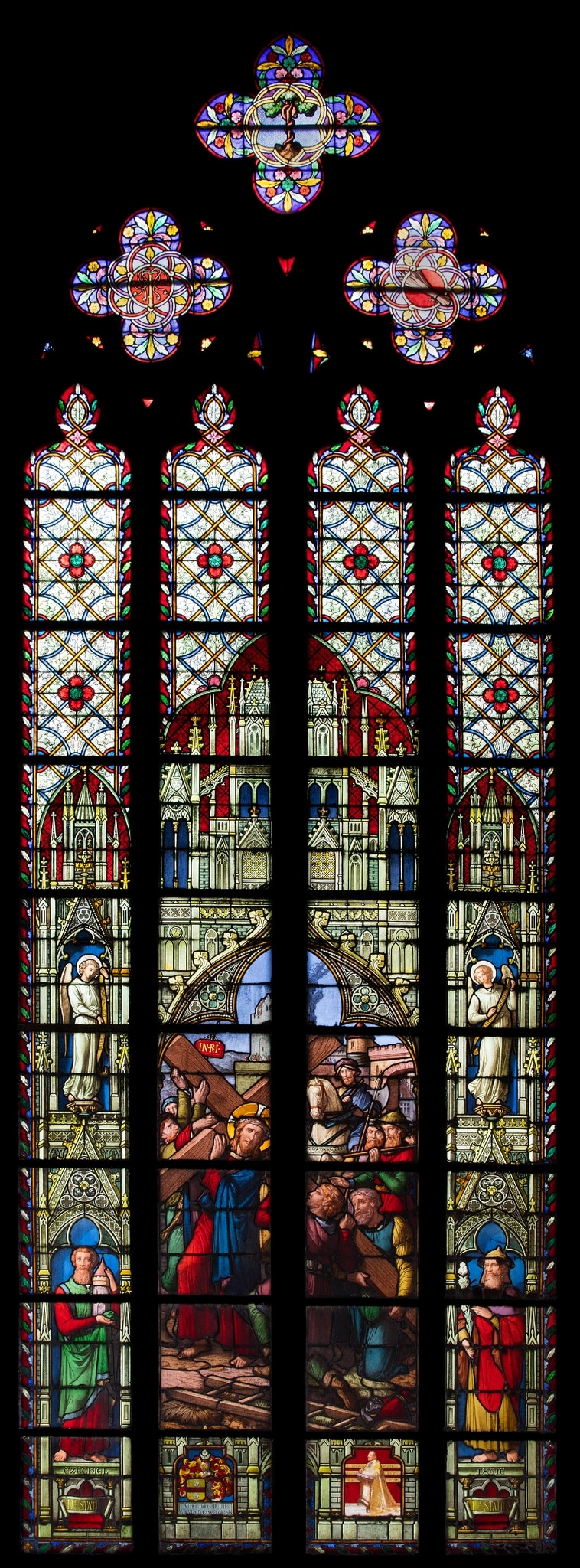 Masswerkfenster mit vier Lanzetten und Couronnement mit drei Vierpässen. In den beiden mittleren Lanzetten ist die 2. Station des Kreuzweges dargestellt: Jesus Christus, bekrönt mit der Dornenkrone, nimmt vor dem Stadttor das Kreuz auf seine Schultern. Er wird von einer Menschenmenge und einem Mann zu Pferd begleitet. Im Vordergrund künden die Leidenswerkzeuge Leiter, Hammer und Zange vom baldigen Kreuzestod Jesu. Die Bildszene ist von einer Rahmenarchitektur im Stil der Gotik gefasst, die mit Fialen bekrönt ist. In den beiden äusseren Lanzetten sind als zur Rahmenarchitektur gehörende Statuen zwei Engel mit Schriftbändern und die Propheten Ezechiel und Jesaja gezeigt. Der Sockel der Rahmenarchitektur ist mit Schriftbändern, einem Stifterwappen und einer Stifterdarstellung (Dekan Delruelle) mit Stifterinschrift geschmückt. Das oberste Viertel der Lanzetten ist mit geometrischen Ornamenten, Grisaillemalerei und einer farbigen Rahmung mit einem Blattmotiv gestaltet. In den Vierpässen sind der Paradiesbaum mit Schlange sowie zwei Leidenswerkzeuge (Geissel und gebündelte Ruten) auf ornamentiertem Hintergrund dargestellt.