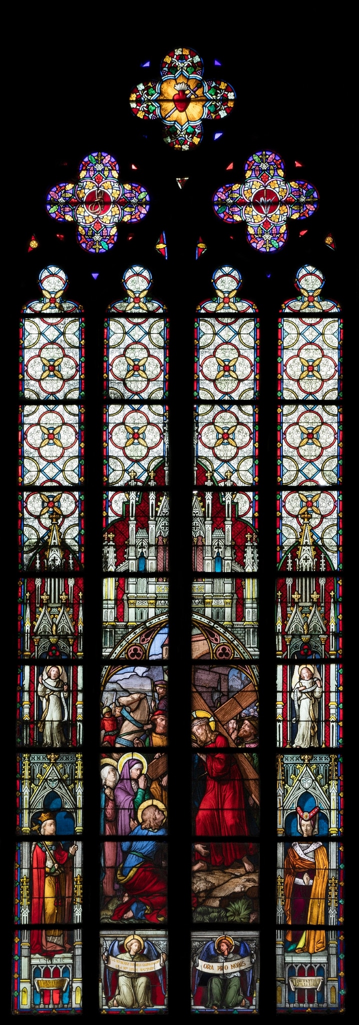 Masswerkfenster mit vier Lanzetten und Couronnement mit drei Vierpässen. In den beiden mittleren Lanzetten ist die 4. Station des Kreuzweges dargestellt: Auf dem Weg nach Golgatha trifft Jesus Christus auf seine Mutter. Gezeigt ist auch der Jünger Johannes, der vor Jesus Christus niederkniet. Die Bildszene ist von einer Rahmenarchitektur im Stil der Gotik gefasst, die mit Fialen bekrönt ist. In den beiden äusseren Lanzetten sind als zur Rahmenarchitektur gehörende Statuen zwei Engel mit Schriftbändern sowie zwei Frauenfiguren gezeigt, links Esther als Königin mit Zepter und Krone, rechts Judith mit Hörnerhaube. Der Sockel der Rahmenarchitektur ist mit Schriftbändern und zwei knienden Engeln geschmückt, die auf ausgerollten Schriftrollen die Stifterinschrift präsentieren. Das oberste Viertel der Lanzetten ist mit geometrischen Ornamenten, Grisaillemalerei und einer farbigen Rahmung gestaltet. In den Vierpässen sind ein brennendes, von einem Schwert durchbohrtes Herz sowie zwei Leidenswerkzeuge (Strick und Rohrkolben (Spottzepter)) auf ornamentiertem Hintergrund dargestellt.