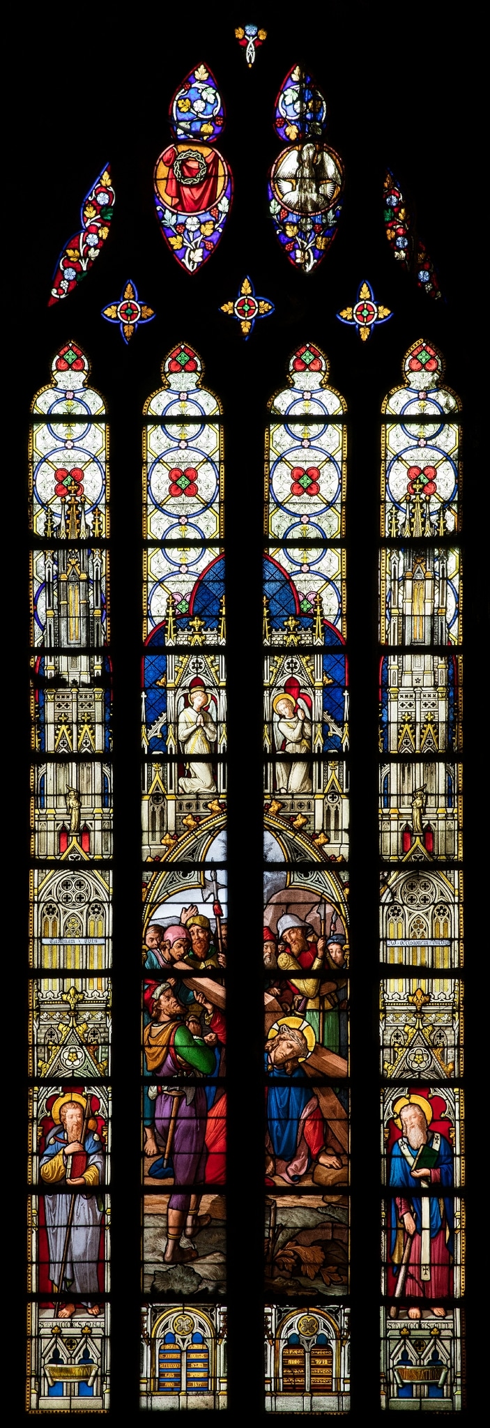 Masswerkfenster mit vier Lanzetten und Couronnement mit zwei Fischblasen. In den beiden mittleren Lanzetten ist die 7. Station des Kreuzweges dargestellt: Jesus Christus stürzt zum zweiten Mal unter der Last des Kreuzes. Die Bildszene ist von einer Rahmenarchitektur im Stil der Gotik gefasst, die mit Fialen und zwei betenden Engeln bekrönt ist. In den beiden äusseren Lanzetten sind als zur Rahmenarchitektur gehörende Statuen der Apostel Jakobus der Ältere mit Muscheln und Pilgerstab sowie der Apostel Jakobus der Jüngere mit Keule gezeigt. Der Sockel der Rahmenarchitektur ist mit Schriftbändern und einer Stifterinschrift geschmückt. Das oberste Viertel der Lanzetten ist mit geometrischen Ornamenten, Grisaillemalerei und einer gelben Rahmung gestaltet. In den Fischblasen sind auf ornamentiertem Hintergrund zwei Leidenswerkzeuge (Dornenkrone und purpurner Mantel) und der Pelikan dargestellt, der seine Jungen mit dem eigenen Blut nährt.
