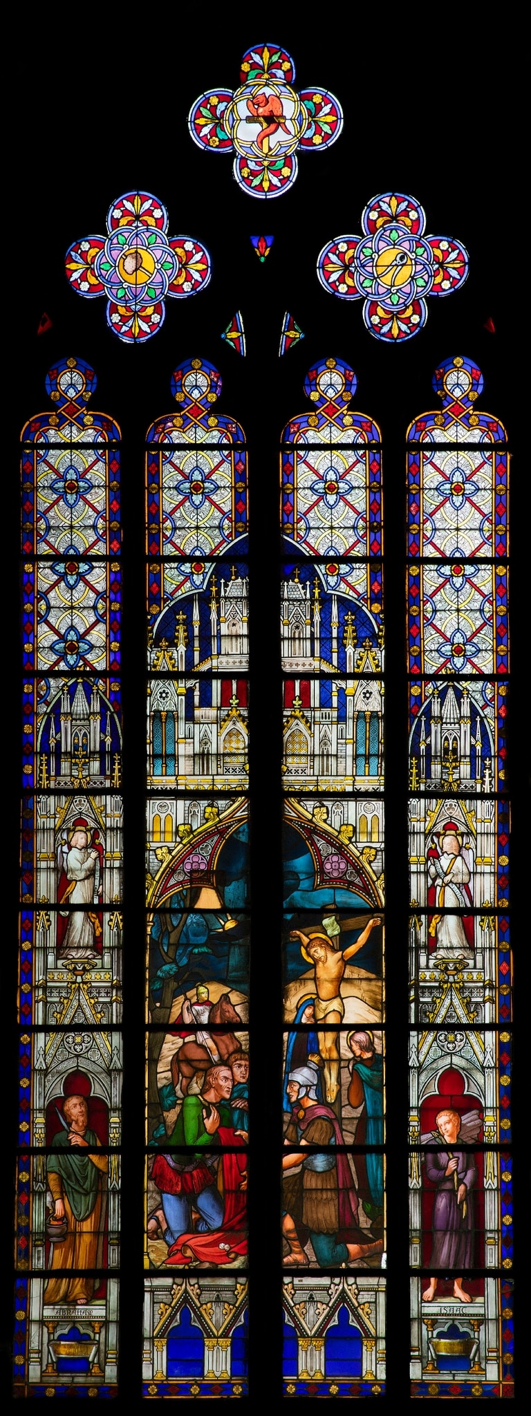 Masswerkfenster mit vier Lanzetten und Couronnement mit drei Vierpässen. In den beiden mittleren Lanzetten ist die 12. Station des Kreuzweges dargestellt: Jesus Christus hat am Kreuz den Tod erlitten, neben ihm stehen die trauernde Mutter Maria und der Jünger Johannes. Ebenfalls im Hintergrund ist ein Reiter mit Lanze dargestellt. Im Vordergrund sind die Soldaten gezeigt, die um den Mantel Jesu würfeln. Die Bildszene ist von einer Rahmenarchitektur im Stil der Gotik gefasst, die mit Fialen bekrönt ist. In den beiden äusseren Lanzetten sind als zur Rahmenarchitektur gehörende Statuen zwei Engel mit Schriftbändern sowie Abraham mit Dolch und Feuerschale und sein Sohn Isaak mit einem Bündel Holz gezeigt. Der Sockel der Rahmenarchitektur ist mit Schriftbändern geschmückt. Das oberste Viertel der Lanzetten ist mit geometrischen Ornamenten, Grisaillemalerei und einer farbigen Rahmung mit Blatt- und Blütenmotiven gestaltet. In den Vierpässen sind ein roter geflügelter Dämon (eherne Schlange?) sowie zwei Leidenswerkzeuge (der mit Essig getränkte Schwamm an einem Rohr und eine Zange) auf ornamentiertem Hintergrund dargestellt.