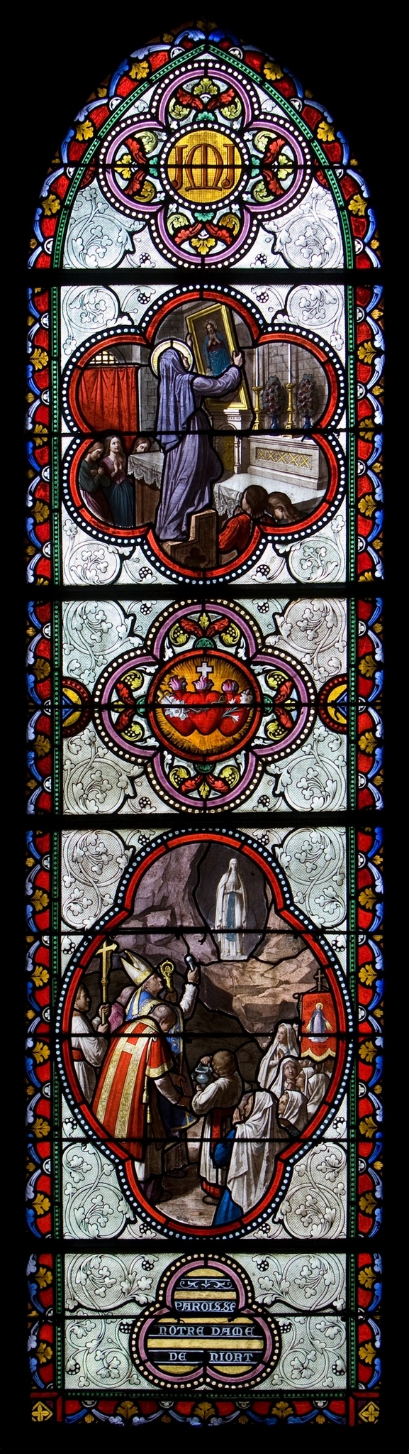 Eine von 41 Glasmalereien in der Basilika der Unbefleckten Empfängnis in Lourdes, die zu Ehren der Jungfrau Maria über der Grotte von Massabielle erbaut wurde. Dort soll die Jungfrau von Februar bis Juli 1858 insgesamt achtzehn Mal der 14-jährigen Bernadette Soubirous (1844–1879) erschienen sein. Die Glasmalereien der Kapellen in Langhaus und Chor berichten von diesen Erscheinungen und weiteren religiösen Höhepunkten in Lourdes Entwicklung zum wichtigsten Wallfahrtsort Frankreichs. Sie werden nach Eintritt in die Kirche von links nach rechts im Uhrzeigersinn gelesen. Die Glasmalereien im Obergaden von Langhaus und Chor thematisieren den Glauben an die unbefleckte Empfängnis (immaculata conceptio), von biblischen Präfigurationen bis zur Verkündung des Dogmas durch Papst Pius IX. am 8. Dezember 1854: seine Bulle Ineffabilis Deus hielt fest, dass die Jungfrau Maria ohne den Makel der Erbsünde empfangenen worden sei. Die Fenster im Obergaden werden zuerst von links zum Chor hin gelesen und danach von rechts zum Chor hin. Durch die Orgel verdeckt ist das Rosenfenster mit Mariensymbolen (?) in der Hauptfassade.