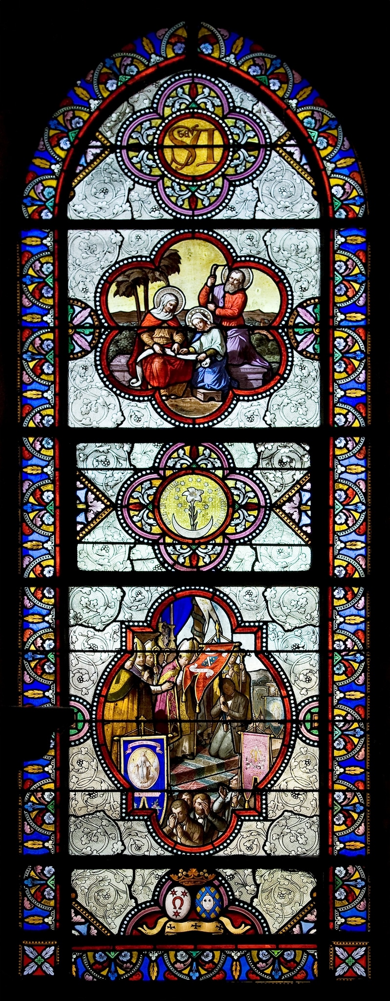 Spitzbogenfenster mit fünf übereinander angeordneten Medaillons. Das grösste Medaillon im unteren Bereich des Fensters ist Teil einer Chronik der Marienerscheinungen von Lourdes und dessen anschliessender Entwicklung zum Wallfahrtsort (1858–1876). Hier ist die Prozession der Banner im Rahmen der ersten Pilgerfahrt von nationaler Bedeutung nach Lourdes am 6. Oktober 1872 dargestellt. Die verschiedenen Pilgergruppen ziehen mit den Bannern ihrer Regionen und Gemeinde an den kirchlichen Würdenträgern vorbei. In einem Akt des Patriotismus küsst Pierre-Henri Gérault de Langalerie, Erzbischof von Auch, das Banner des kürzlich an das Deutsche Kaiserreich abgetretenen Elsasses. Im oberen Bereich des Fensters ist in einem Sechspass gezeigt, wie die heilige Anna – ihr ist die Kapelle gewidmet, in der sich das Fenster befindet – ihrer Tochter Maria im Beisein von Joachim das Lesen beibringt. Darüber erscheint in einem Vierpass das Monogramm der Heiligen. Der stehende Vierpass im Zentrum des Fensters ist mit einer Lilie über einer Mondsichel geschmückt, Symbol für die mit Maria schwangere Anna. Am Fuss des Fensters halber Vierpass mit Stifterwappen. Die Medaillons liegen auf einem mit Blüten- und Blattranken in Grisaille dekorierten Grund; ein im Stil der Gotik mit farbigen Blattornamenten gestalteter Rahmen fasst das Fenster ein.