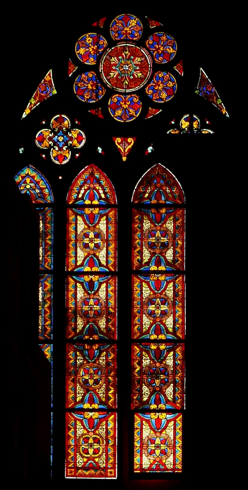 Die Ausführung der Glasmalereien für die vier romanischen Rundbogenfenster im Chorumgang und für das Westfenster des Basler Münsters wurde dem in Paris arbeitenden St. Galler Caspar Gsell übertragen, dem künstlerischen Leiter der Firma Laurent, Gsell et Cie., der in der Schweiz durch sein frühes monumentales Bildfenster für die Laurenzenkirche in St. Gallen (CG_63, 1853) auf sich aufmerksam gemacht und 1855 mehrere Glasmalereien und Zeichnungen an der Weltausstellung in Paris ausstellte (siehe Sanchez, 2005, S. 691 und 882). Kommissionsmitglied Merian-Von der Mühll besuchte diese Weltausstellung und knüpfte vor Ort Kontakt mit Gsell. Der Vertrag mit Caspar Gsell sah die Lieferung des grossen ornamentalen Westfensters bis zum 1. März 1856 vor, sowie der vier Chorumgangsfenster bis zum 1. Mai 1856. Die Glasmalereien hatten «gutgemalt und eingebrannt ohne kalte Übermalung» für einen Gesamtpreis von 7500.– Franken gefertigt zu werden (Staatsarchiv Basel-Stadt, Bau JJ 5, Vertrag mit C. Gsell, 24. November 1855). Die Vorschriften für die Gestaltung des grossen Westfensters hinter dem Orgelprospekt waren besonders ausführlich (siehe Rapp, 1981, S. 321). Es sollte nur «architektonisch verziert» und durch eine Lasur mattiert werden, um die Orgel vor Licht zu schützen (Staatsarchiv Basel-Stadt, PA 319 I D 1, Protokoll der Kommission zu den Kirchenfenstern des Münsters, 18. August 1855). Mit dem im Oktober 1855 eingesandten Entwurf war die Kommission nicht zufrieden, da er zu dunkel konzipiert und im Couronnement eine Figur aufwies (Protokoll Kirchenfenster-Kommission, 20. Oktober 1855). Im Mai 1856 wurde das Fenster mit einer Verspätung von zwei Monaten in der Westfassade eingesetzt (Protokoll Kirchenfenster-Kommission, 5. Mai 1856). Als im September 1857 der Orgelbauer darüber klagte, dass zu starkes Sonnenlicht durch das Westfenster auf das Orgelwerk falle, riet der eben anwesende Münchner Glasmaler Max Ainmiller (1807–1870) dazu, es mit einem Wasserglasfirnis zu bestreichen (Protokoll Kirchenfenster-Kommission, 22. September 1857).