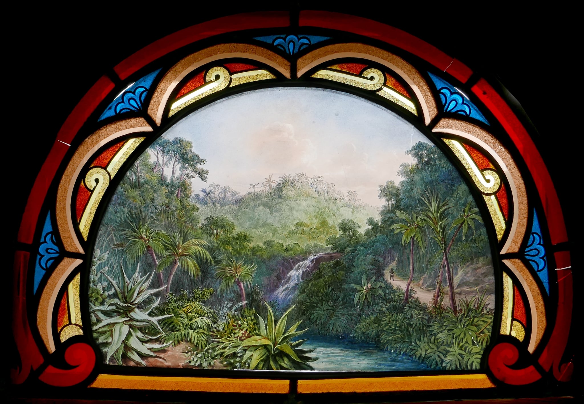 Glasmalerei in der Form eines Kreissegments, die ursprünglich wohl im oberen Bereich eines Fensters oder einer Tür angebracht war. Dargestellt ist eine brasilianische Urwaldlandschaft bei Rio de Janeiro mit einem Wasserfall, Palmen und Agaven. Auf der rechten Seite ist ein Weg zu sehen, auf dem ein Mann bergaufwärts schreitet. Die Bildszene ist in einen ornamentalen Rahmen in Rot, Gelb und Blau gefasst.