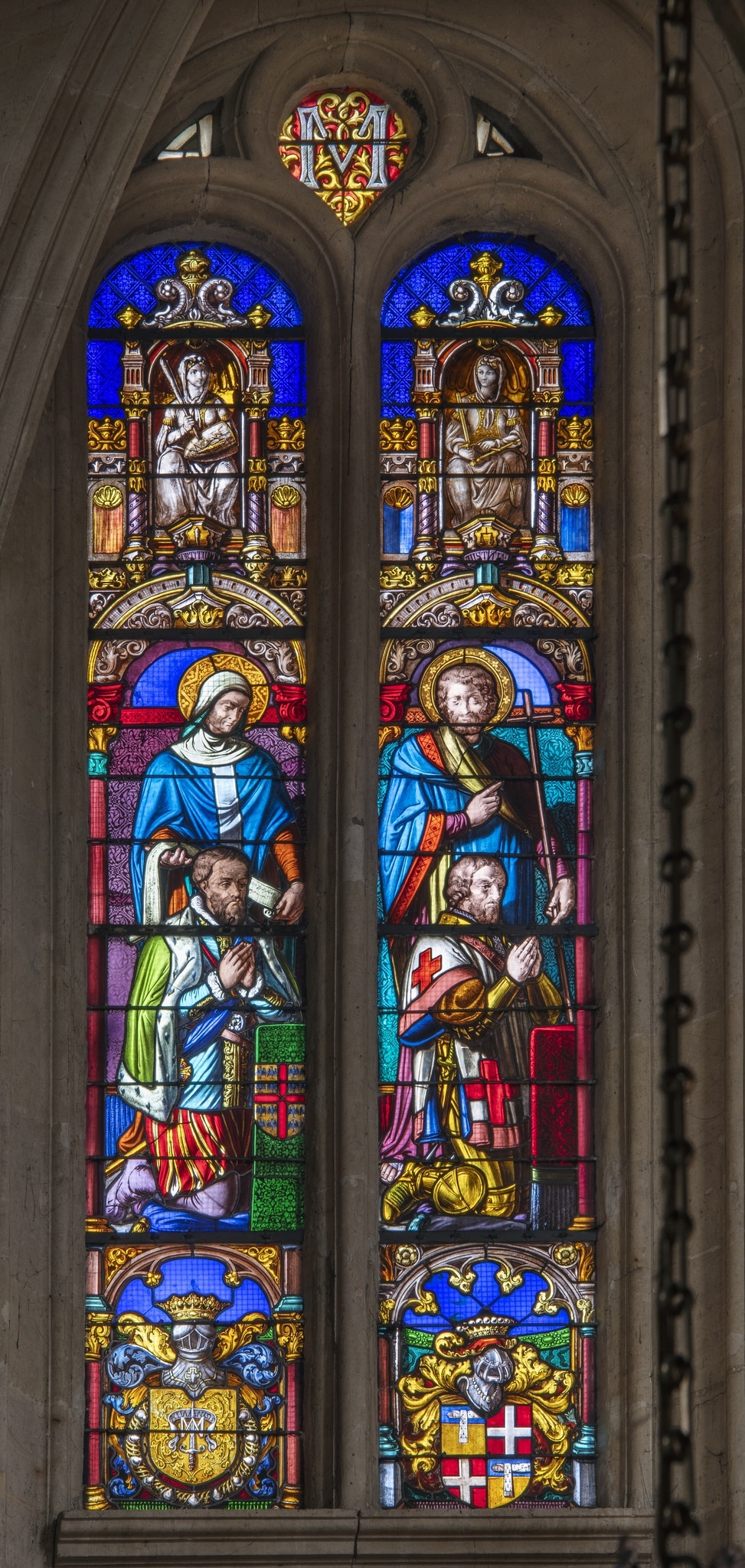Masswerkfenster mit zwei in Rundbogen endenden Lanzetten, darüber kopfstehendes, tropfenförmiges Couronnement. In den zwei zentralen Registern sind kniend und betend zwei frühe Förderer der Kirche von L’Isle-Adam mit ihren Schutzpatronen gezeigt, analog zu S II (CG_78). Links ist der Herzog und Pair Anne de Montmorency, Grundherr von L’Isle-Adam (1527–1567) in reicher und farbiger Renaissance-Kleidung dargestellt. Hinter ihm steht in einen blauen Mantel gehüllt die heilige Anna mit einem Schriftband in den Händen. Rechts ist Philippe de Villiers de L’Isle-Adam, letzter Grossmeister des Johanniterordens (1521–1534), in einer goldenen Rüstung und einem weissen Umhang mit roten Kreuzen gezeigt. Hinter ihm steht der Apostel Philippus in farbigem Gewand, mit einer Hand auf seinen Kreuzstab zeigend. Alle Figuren sind zum zentralen Eucharistie-Fenster (CG_77) hin ausgerichtet. Sie sind von zwei reich geschmückten Renaissance-Baldachinen auf blauem Grund überfasst, in denen allegorische Darstellungen von zwei christlichen Kardinaltugenden untergebracht sind. Links die Tapferkeit als sitzende Frau mit Keule und Schild, rechts die Gerechtigkeit als sitzende Frau mit Schwert und Waage in den Händen. Im untersten Register sind in architektonischen Rahmen die Vollwappen von Anne de Montmorency und Philippe de Villiers de L’Isle-Adam gezeigt. Im Couronnement verweist der in ein Rankenornament eingestellte Buchstabe «M» auf den heiligen Martin, den Schutzpatron der Kirche.