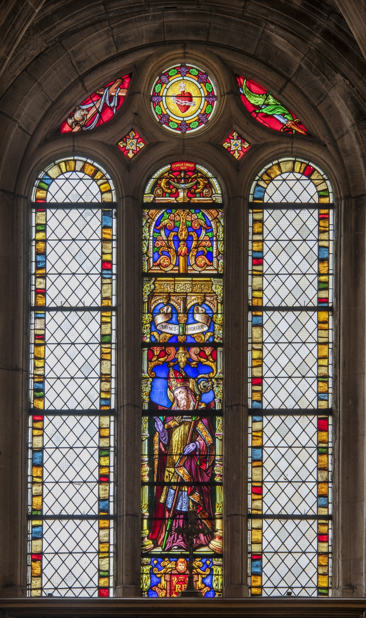 Das Chrodegang-Fenster der Kirche Saint-Martin in L’Isle-Adam wurde um 1851/52 durch Jean-Baptiste Grimot (1810–1885; ab 1848 bis zu seinem Tod Pfarrer von L’Isle-Adam) gestiftet und im Pariser Glasmalerei-Atelier Laurent, Gsell et Cie. (später Gsell-Laurent) für 650 Francs hergestellt (L’Isle-Adam, Musée d’Art et d’Histoire Louis-Senlecq: Archives paroissiales, Carton 6, Registre des délibérations de la Fabrique de la Paroisse Saint-Martin 1825–1893, S. 191, 208–209). Anlass für die Stiftung war eine Renovation der Chrodegang-Kapelle, in der seit 1711 die Schädelreliquie des 769 ermordeten Bischofs von Séez aufbewahrt wird.