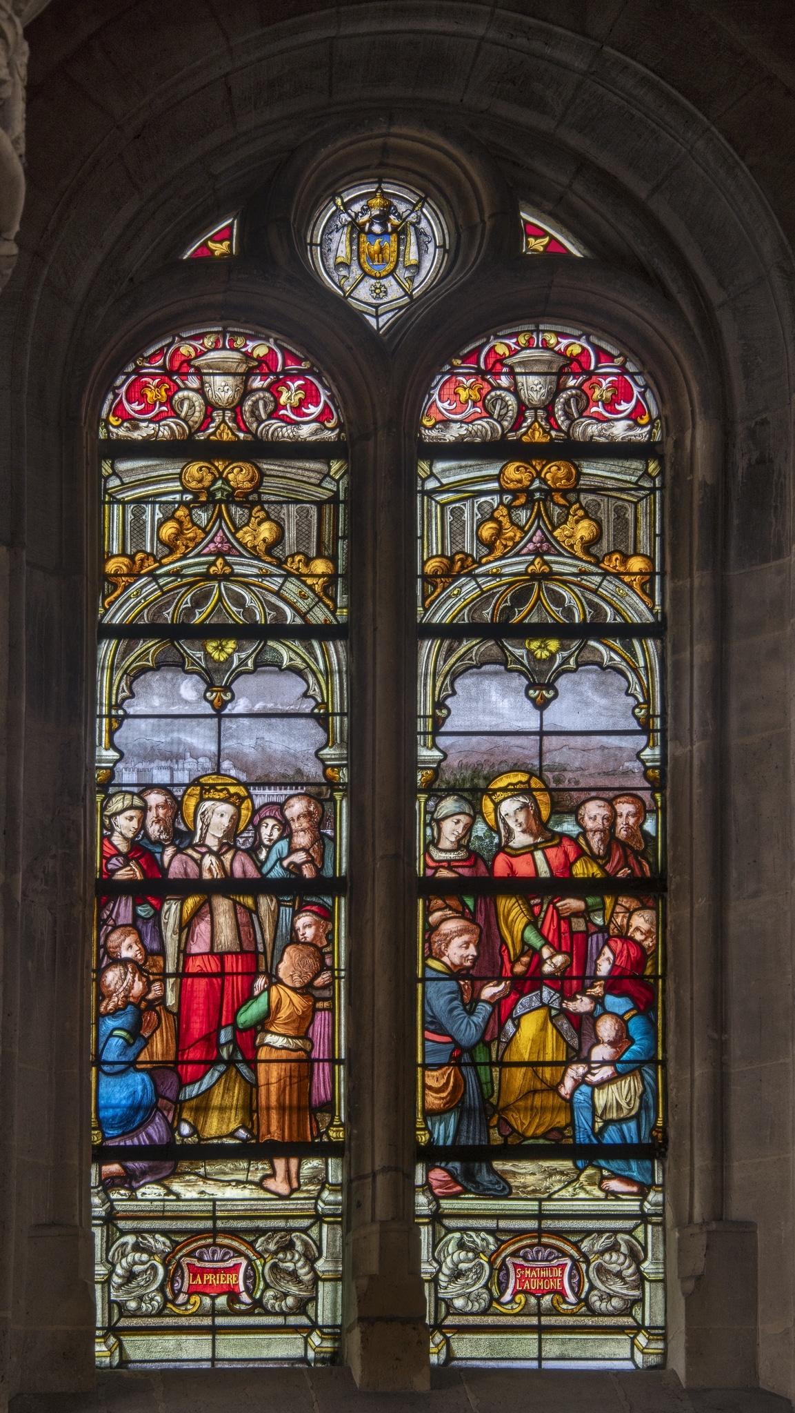 Das Mathilde-Fenster ist eine von insgesamt 14 Glasmalereien aus dem Pariser Glasmalerei-Atelier Laurent, Gsell et Cie. (später Gsell-Laurent), mit denen um 1861 das Querschiff und der westliche Teil des Langhauses der Kirche Saint-Martin in L’Isle-Adam ausgestattet wurden (L’Isle-Adam, Musée d’Art et d’Histoire Louis-Senlecq: Archives paroissiales, Carton 6, Registre des délibérations de la Fabrique de la Paroisse Saint-Martin 1825–1893, S. 217). Die Fenster des westlichen Teils des Langhauses, zu denen das Mathilde-Fenster gehört, folgen alle demselben Gestaltungsprinzip und zeigen Szenen aus dem Leben biblischer Personen und Heiliger. Im Musée Carnavalet in Paris wird eine Entwurfszeichnung zu diesem Fenster aufbewahrt (D.16314), auf der die Gestaltung des Couronnement und des landschaftlichen Hintergrunds leicht von der umgesetzten Glasmalerei abweichen.
