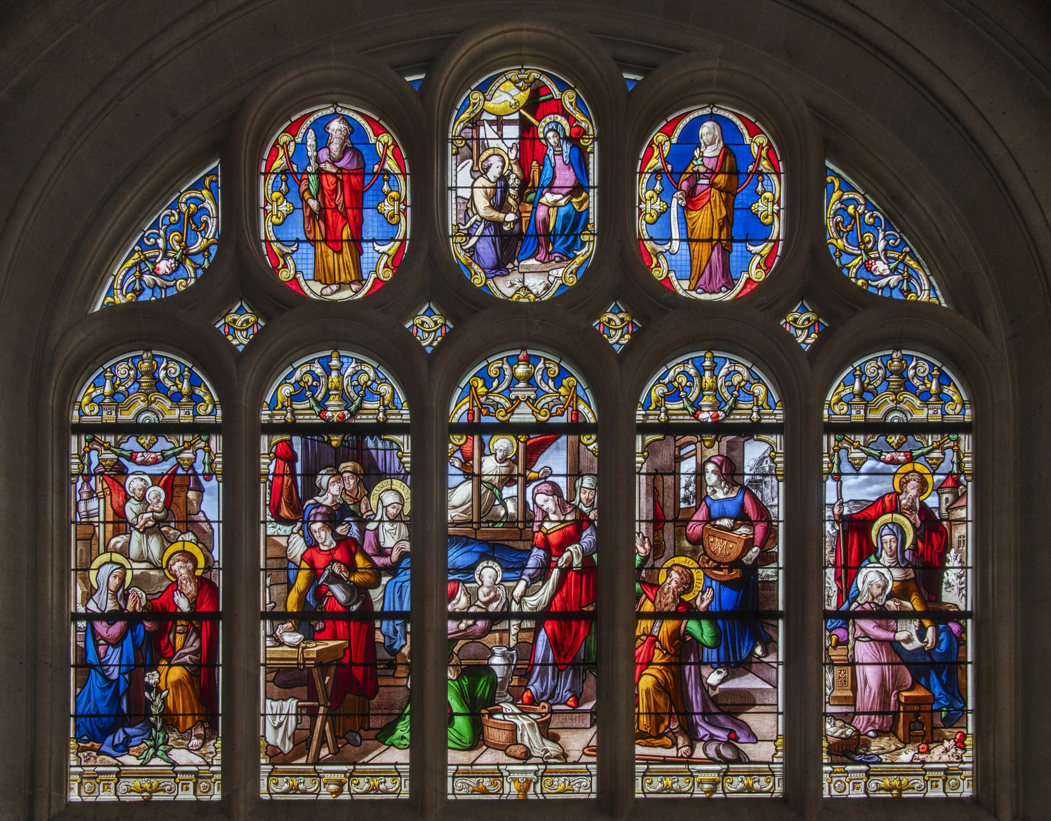 Masswerkfenster mit fünf in Rundbogen endenden Lanzetten, darüber Couronnement mit drei ovalen Öffnungen und mehreren Masswerk-Zwickeln. In den Lanzetten sind, gefasst von architektonischen Rahmen und unter Baldachinen im Stil der Renaissance, drei Bildszenen rund um die Geburt Marias gezeigt. Links die Begegnung Annas und Joachims an der Goldenen Pforte in Jerusalem: Joachim hat eine Hand auf die gefalteten Hände Annas gelegt; eine weisse Lilie im Vordergrund und ein Engel mit einem Kind im Hintergrund weisen auf die unbefleckte Empfängnis Marias hin. In den mittleren drei Lanzetten ist die Geburt Marias dargestellt: Anna liegt mit gefalteten Händen auf dem Bett, während sich mehrere Hebammen um Mutter und Kind kümmern; die eine hält das frisch gebadete Mädchen einer anderen hin, die es mit einem Tuch in Empfang nimmt; Joachim kniet mit erhobenen Armen am Fuss des Betts, hinter ihm bringt eine Frau eine Wiege und durch ein Fenster im Hintergrund blickt ein Engel auf das Neugeborene. Rechts als dritte Bildszene die Erziehung Marias: Das Mädchen kniet auf einem Schemel neben seiner Mutter und liest aus einer Schriftrolle, die Anna auf ihrem Schoss ausgerollt hat; hinter den beiden steht Joachim mit dem Hirtenstock. Der unterste Bereich der Lanzetten ist als schmaler architektonischer Sockel gestaltet. In den ovalen Öffnungen im Couronnement sind, von ornamentalen Rahmen eingefasst, die Verkündigung an Maria, sowie Joachim und Anna als Ganzfiguren mit weisser Lilie und Schriftrolle (Anna) auf blauem Grund gezeigt. Masswerk-Zwickel mit ornamentalen Füllungen.