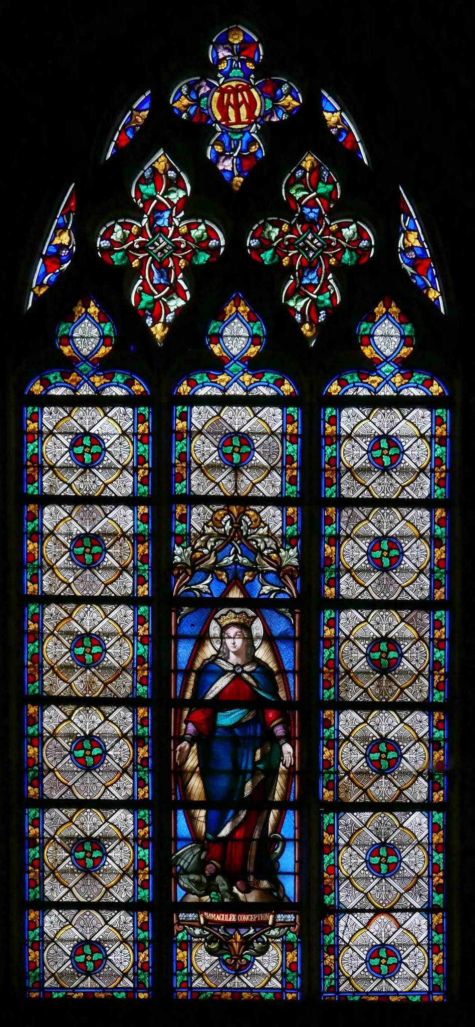 Dreilanzettiges Masswerkfenster mit einer Darstellung der Jungfrau Maria in der mittleren Lanzette. Die gekrönte Maria erscheint in einer Mandorla vor blauem Hintergrund und in einen Rahmen mit Blattranken eingefasst. Sie ist in ein rotes Gewand und einen blauen Mantel gekleidet, hat die Hände leicht ausgebreitet und steht auf einem Drachen. Unterhalb des Bildes Schriftband. Im Übrigen sind die Lanzetten mit Ornamenten in Grisaille und mit farbigen Blattmustern (Rahmen und Medaillons) gestaltet. Masswerk mit farbigen Ranken und Marienmonogramm.