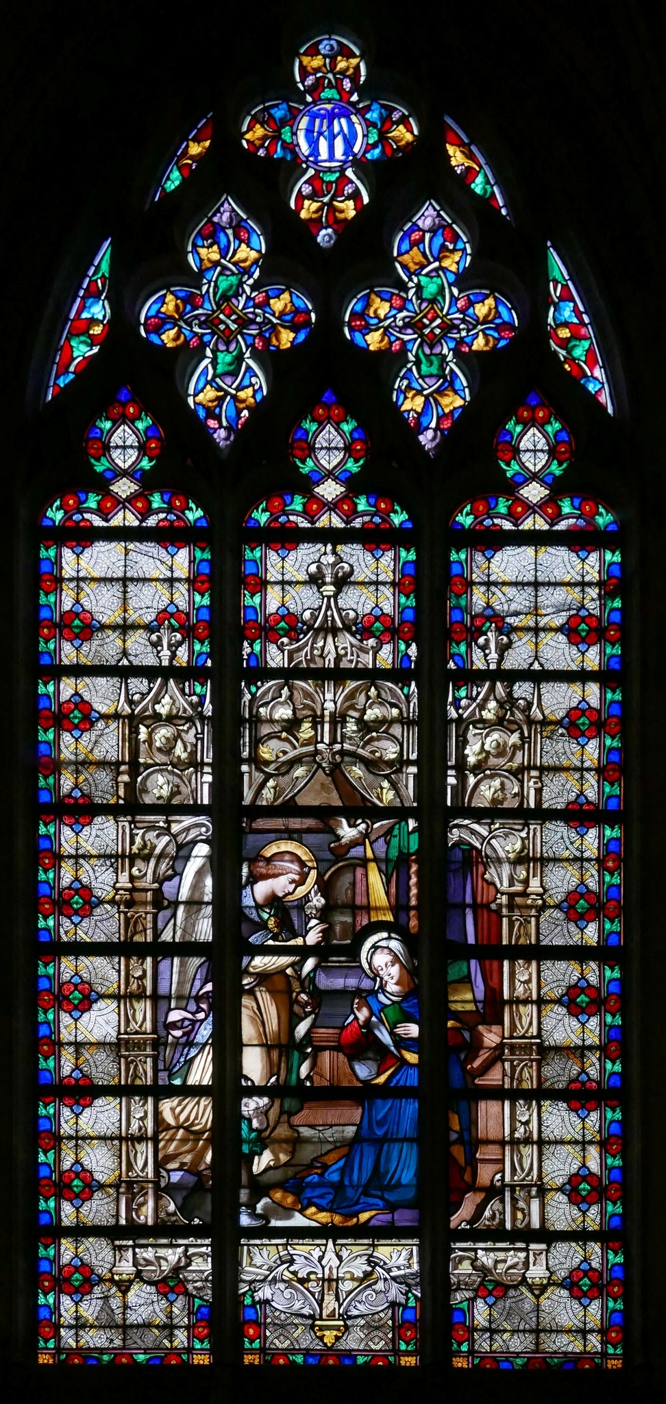 Dreilanzettiges Masswerkfenster mit einer Darstellung der Verkündigung in den Lanzetten. Eingefasst von einem neugotischen architektonischen Rahmen ist Maria in einem Innenraum kniend gezeigt. Über ihrem Haupt schwebt als Taube der Heilige Geist, während links neben ihr der Engel mit einem Strauss weisser Lilien an sie herantritt. Der übrige Bereich der Lanzetten ist mit Ornamenten in Grisaille und mit farbigen Blattmustern (Rahmen und Medaillons) gestaltet. Masswerk mit farbigen Ranken und Marienmonogramm.