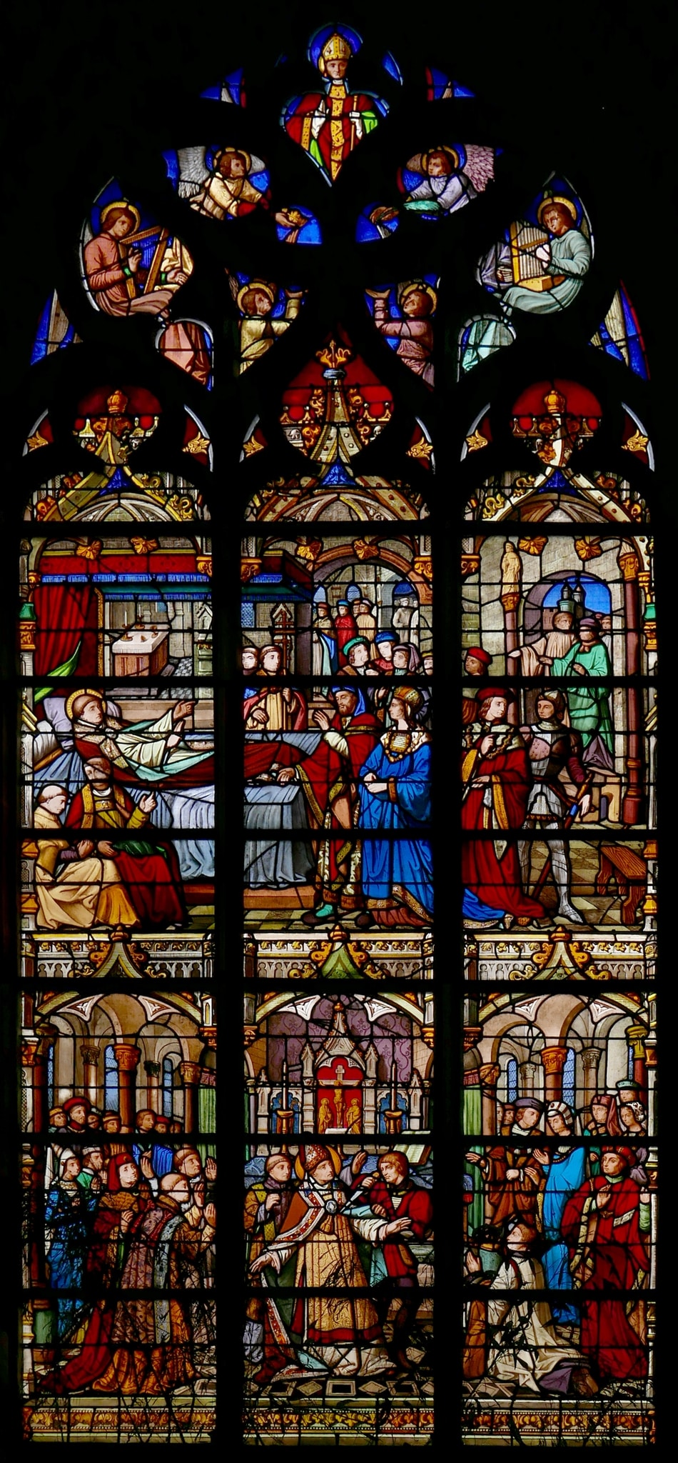 Dreilanzettiges Masswerkfenster mit zwei übereinander angeordneten Bildszenen zur Vita des heiligen Praetextatus. Unten ist das Attentat auf Praetextatus am Ostertag 586 gezeigt. Der Bischof von Rouen steht, in festlichem Ornat und umgeben von Gläubigen, mit ausgebreiteten Armen vor dem Kirchenaltar. Sein Mörder sticht ihm von rechts einen Dolch in die Brust. Über dieser Bildszene ist der tödlich verwundete Bischof auf seinem Sterbebett dargestellt, an dem sich zahlreiche Personen einfinden. Praetextatus beschuldigt die ihn mit einem Arzt besuchende Fredegunde, seine Ermordung in Auftrag gegeben zu haben. Die eine Hand des Bischofs vollführt einen Abwehrgestus, während die andere auf Fredegunde zeigt. Im Hintergrund ist der Kirchenraum mit dem Altar sichtbar. Beide Bildszenen sind von Baldachinen im Stil der Gotik überfangen. Masswerkfüllungen mit der Halbfigur des Bischofs, umgeben von teils musizierenden Engeln.