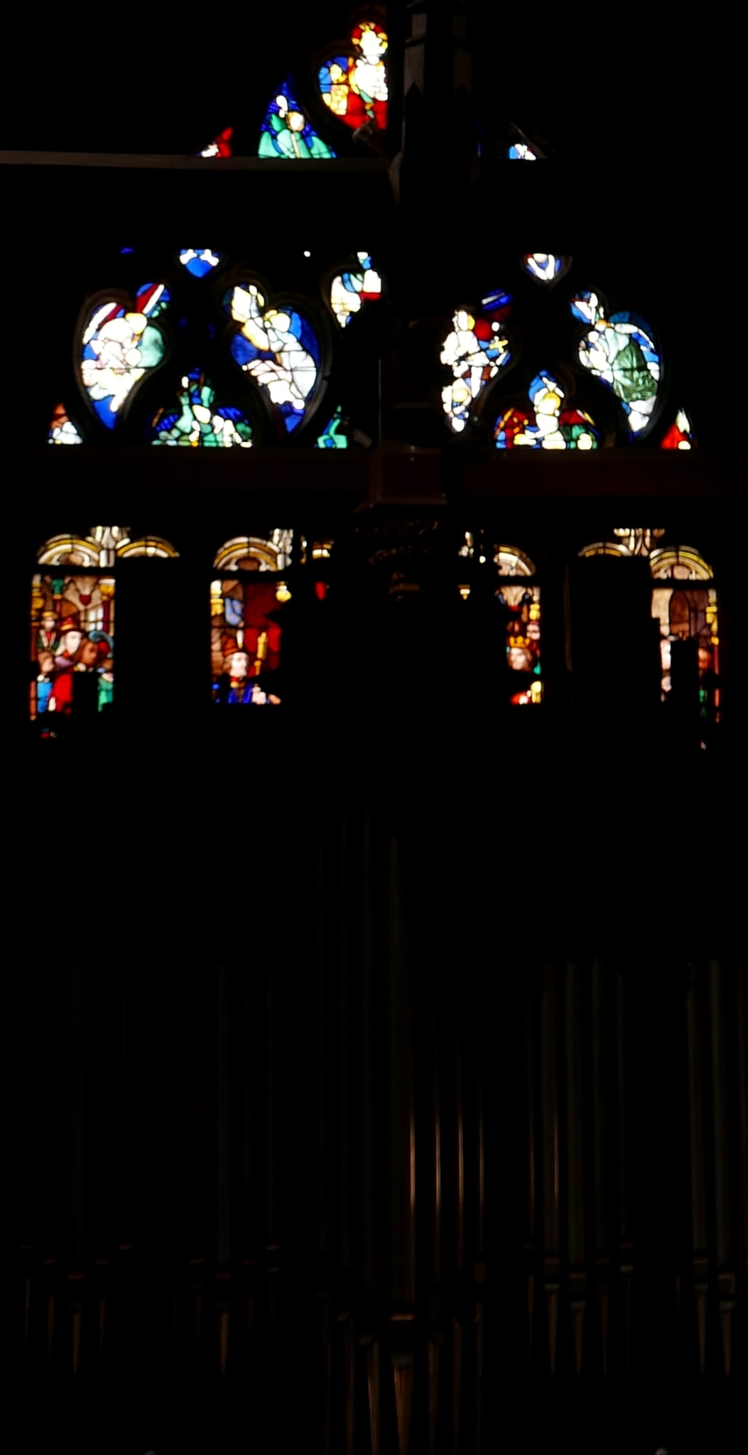 Vierlanzettiges Masswerkfenster mit zwei übereinander angeordneten Bildszenen zur Vita des heiligen Ludwig IX. Beide Bildszenen sind durch die Orgel auf der Empore grösstenteils verdeckt. Laut der Literatur ist unten die Einnahme von Damiette durch König Ludwig IX. im Kreuzzug gegen Ägypten gezeigt. In der oberen Bildszene leitet der König, in Vorbereitung des zweiten Kreuzzugs seiner Herrschaft, die Versammlung der Barone seines Reichs. Die Masswerkfüllungen zeigen den Kampf der Engel und Dämonen.