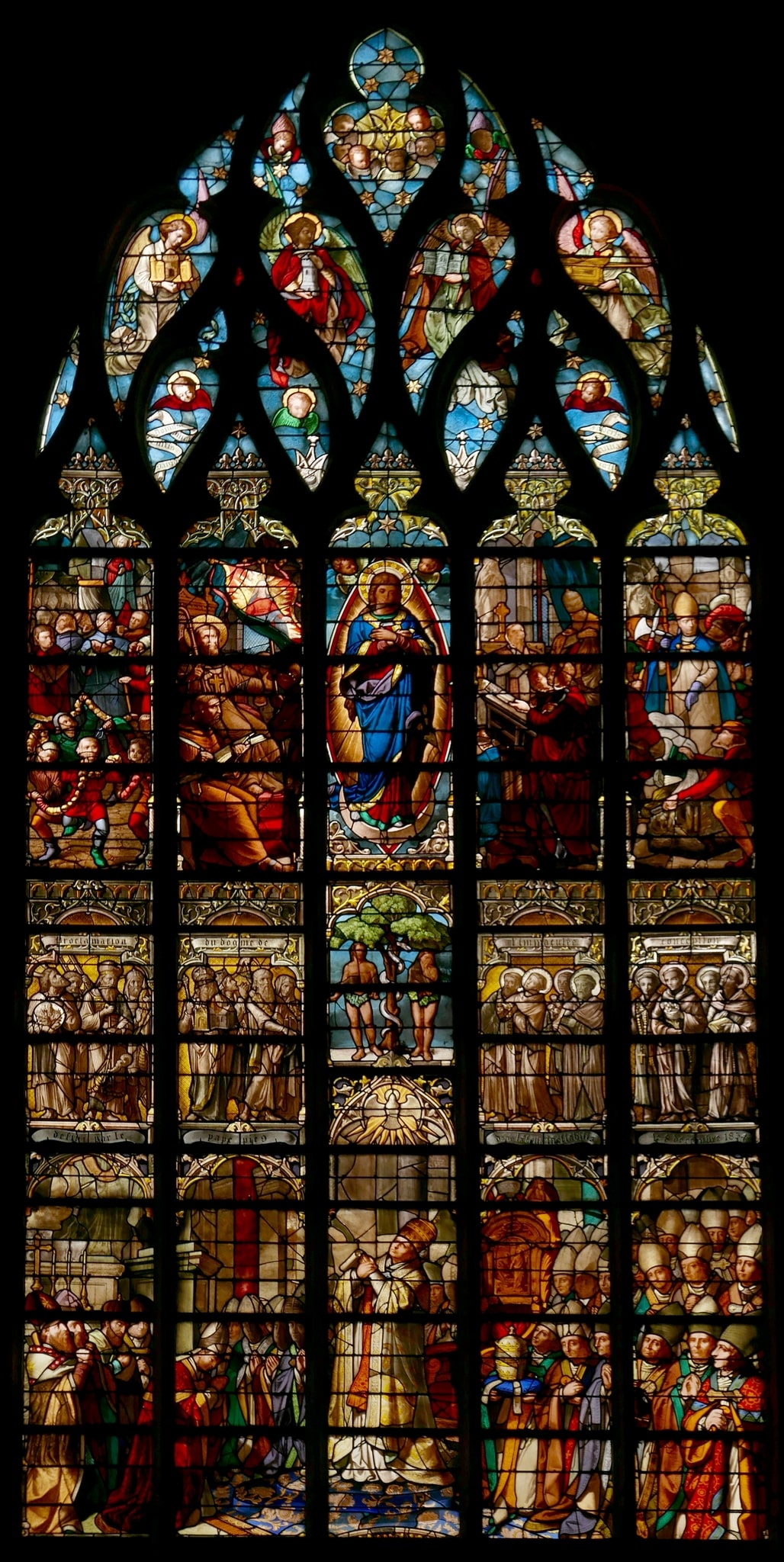 Im Zentrum des obersten Registers der Lanzetten steht Maria auf einer Mondsichel in einer Mandorla. Sie hat die Hände über der Brust gekreuzt und ist von zwei Putten flankiert. Links und rechts davon sind vier historische Ereignisse gezeigt, die mit der Verehrung der Gottesmutter Maria als von der Erbsünde Bewahrte in Verbindung stehen. Die Szene ganz links ist der Festivität des «Puy de la conception» oder der «Palinods» von Rouen gewidmet, einem Dichterwettbewerb zum Lob der unbefleckten Empfängnis Marias.