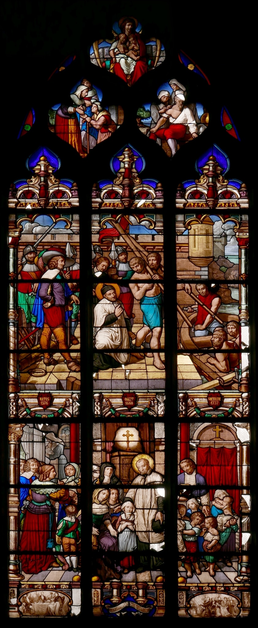 Dreilanzettiges Masswerkfenster mit zwei übereinander angeordneten Bildszenen zur Vita des heiligen Vinzenz von Paul. Unten ist der Priester Vinzenz von Paul inmitten einer Kinderschar zu sehen, vermutlich in einem Waisenhaus, für deren Einrichtung er sich einsetzte. Nebst den Kindern sind bürgerliche Frauen und Männer sowie eine Nonne gezeigt, welche die Waisen betreuen. Darüber ist der heilige Vinzenz von Paul als Generalseelsorger der Galeeren dargestellt. Er kniet vor einem Fort auf einem Hafenkai und hält zwei Gefangene zurück, die sich mit geschulterten Rudern zu einem Boot aufmachen. Hinter ihm stehen Soldaten mit Helmen und Hellebarden und ihr Befehlshaber mit federbesetztem Hut und einer Kanone zu seinen Füssen. Die Bildszenen sind von architektonischen Rahmen im Stil der Renaissance eingefasst, die teils mit Schriftkartuschen besetzt sind. Am Fuss der Lanzetten erinnern zwei Bildmedaillons in Grisaille an die Fenster-Stifter. Links sind Mitglieder der «Société de Saint-Vincent-de-Paul» in Rouen gezeigt, die sich vor der Büste des Heiligen zu einer Besprechung eingefunden haben. Rechts beten die Mitglieder der Gemeinschaft vor einem Altar, ein dreilanzettiges Fenster als Gabe an die Kirche überreichend. Die Masswerkfüllungen zeigen zwei Taten der Nächstenliebe, die Vinzenz von Paul förderte: zwei Frauen geben einer armen alten Frau Almosen und zwei Nonnen pflegen einen verletzten Mann. Darüber thront ein Engel mit zwei Kindern auf dem Schoss.