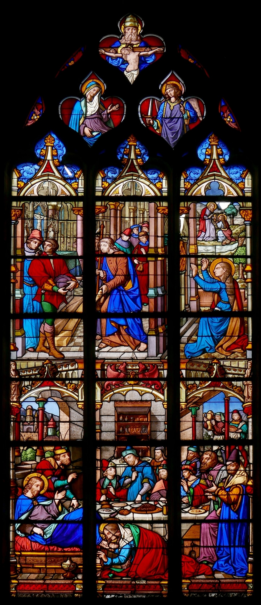 Dreilanzettiges Masswerkfenster mit zwei übereinander angeordneten Bildszenen zur Vita von zwei weiblichen Heiligen. Unten ist die Salbung von Bethanien gezeigt. Zu Ehren von Jesus anlässlich der Auferweckung des Lazarus wird ein Festmahl gegeben, zu dem sich eine Gruppe von Männern um einen reich gedeckten Tisch versammelt. Im Vordergrund ist Jesus zu sehen, der auf einer Bank Platz genommen hat und dem Maria Magdalena die Füsse mit Öl salbt (Joh 12, 1–8). Darüber ist die Wallfahrt von Maria von Ägypten zum Heiligen Kreuz nach Jerusalem dargestellt. Links drängen Männer in eine Kirche, vermutlich in die Grabeskirche in Jerusalem. Rechts betet Maria von Ägypten – die an der Tür zur Grabeskirche von unsichtbarer Hand am Eintritt gehindert wurde – vor einem Marienbildnis um den Beistand der Gottesmutter. Im Hintergrund ist ein weiteres Ereignis aus ihrem Leben gezeigt. Die zum Christentum bekehrte Maria von Ägypten hat sich mit drei Broten in die Wüste jenseits des Jordans zurückgezogen, wo sie vom Mönch Zosimus die Kommunion erhält. Die Bildszenen sind durch architektonische Rahmen mit Dekor im Stil der Gotik gefasst. Masswerkfüllungen mit den Halbfiguren von Maria (?), einem Engel mit Schwert sowie Gottvater, das Kruzifix haltend.