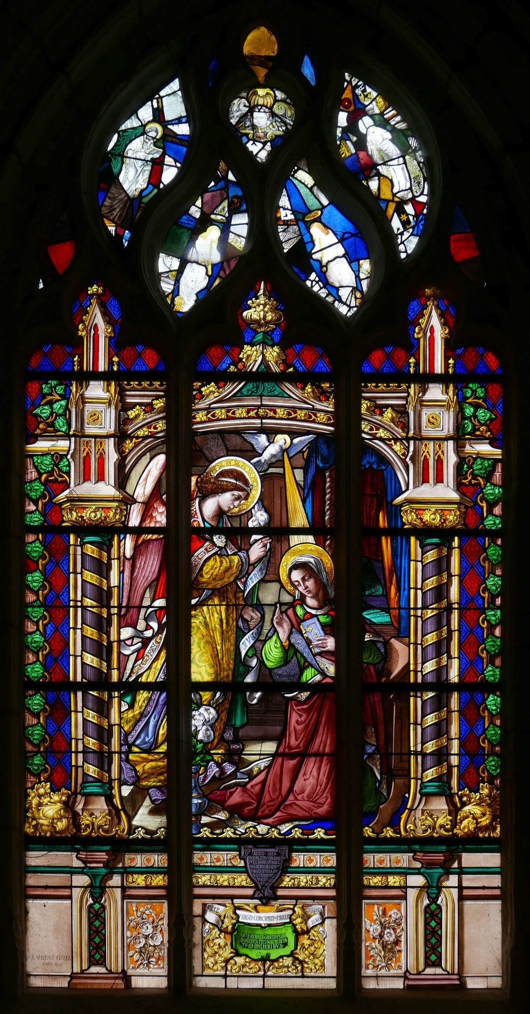 Masswerkfenster mit drei in Nonnenköpfen endenden Lanzetten, darüber Couronnement mit Flamboyant-Masswerk. In den drei Lanzetten ist die Verkündigung an Maria (Lk 1, 26–38) gezeigt. Die Jungfrau Maria kniet mit einem Buch in der Hand vor einem Lesepult und dreht sich zum Engel Gabriel um, der ihr mit einer weissen Lilie in der Hand die Geburt Jesu ankündigt. Neben Maria steht eine Vase mit weissen Lilien, über Maria schwebt der Heilige Geist in Form einer Taube. Die Bildszene ist gefasst von einem reichen architektonischen Rahmen im Stil der Gotik und Renaissance (analog zum Fenster n V). Im Sockel Schriftkartuschen mit Inschriften und Signatur. Für die Masswerkfüllungen wurden Reste einer früheren Verglasung wiederverwendet.