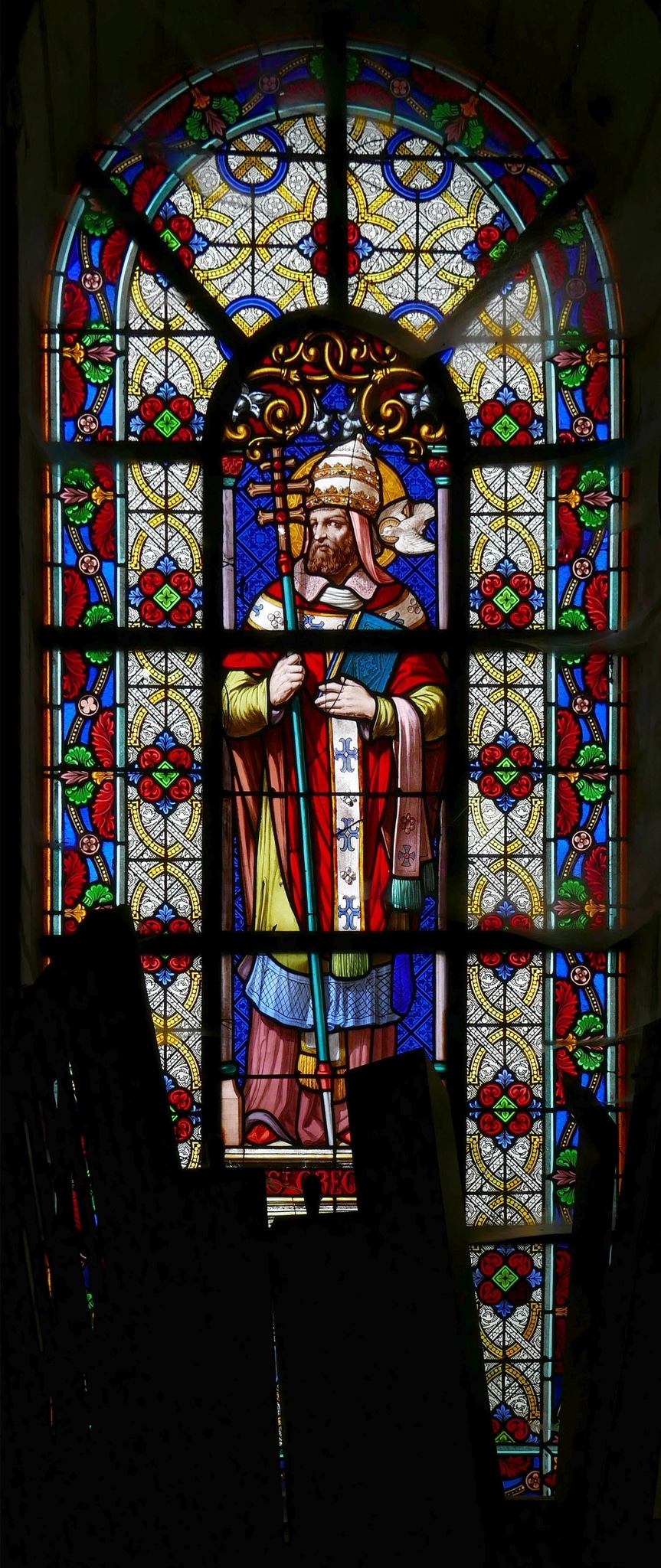 Rundbogenfenster mit der Ganzfigur des stehenden Papstes Gregorius im Zentrum. Der Papst ist in eine Kasel mit Stola gewandet, trägt eine reich geschmückte Tiara auf dem Kopf sowie in den Händen ein Buch und den Kreuzstab. Neben seinem Ohr schwebt die Taube des Heiligen Geistes. Die Ganzfigur vor blauem Hintergrund ist mit einem schmalen architektonischen Rahmen im Stil der Gotik eingefasst. Darunter Sockel mit dem Namen des Heiligen. Die übrige Fensterfläche füllen ein geometrisches Muster in Grisaille mit farbigen Akzenten und ein breiter Rahmen mit stilisiertem Blattmuster (analog zum Fenster auf der Südseite der Empore).