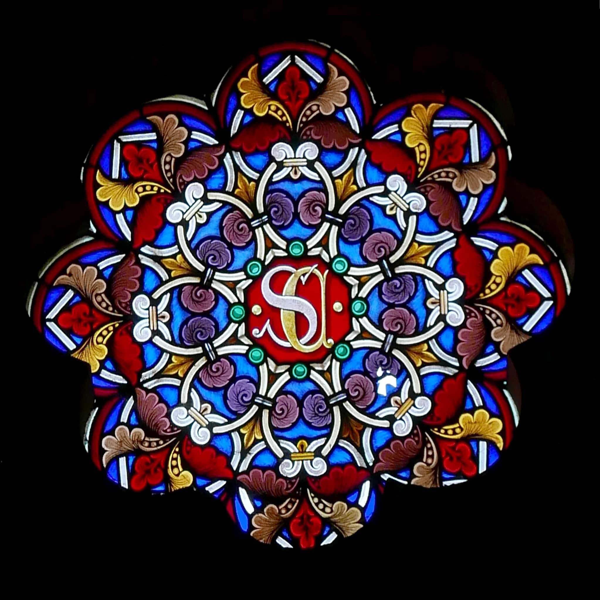 Achtpassfenster mit farbigem, kreisförmig angeordneten Blatt- und Rankendekor im Stil der Gotik. Grundfarben Blau, Rot, Gelb (identisch mit s III). Im Zentrum auf rotem Grund das verschlungene Monogramm SC für den heiligen Claudius von Condat.