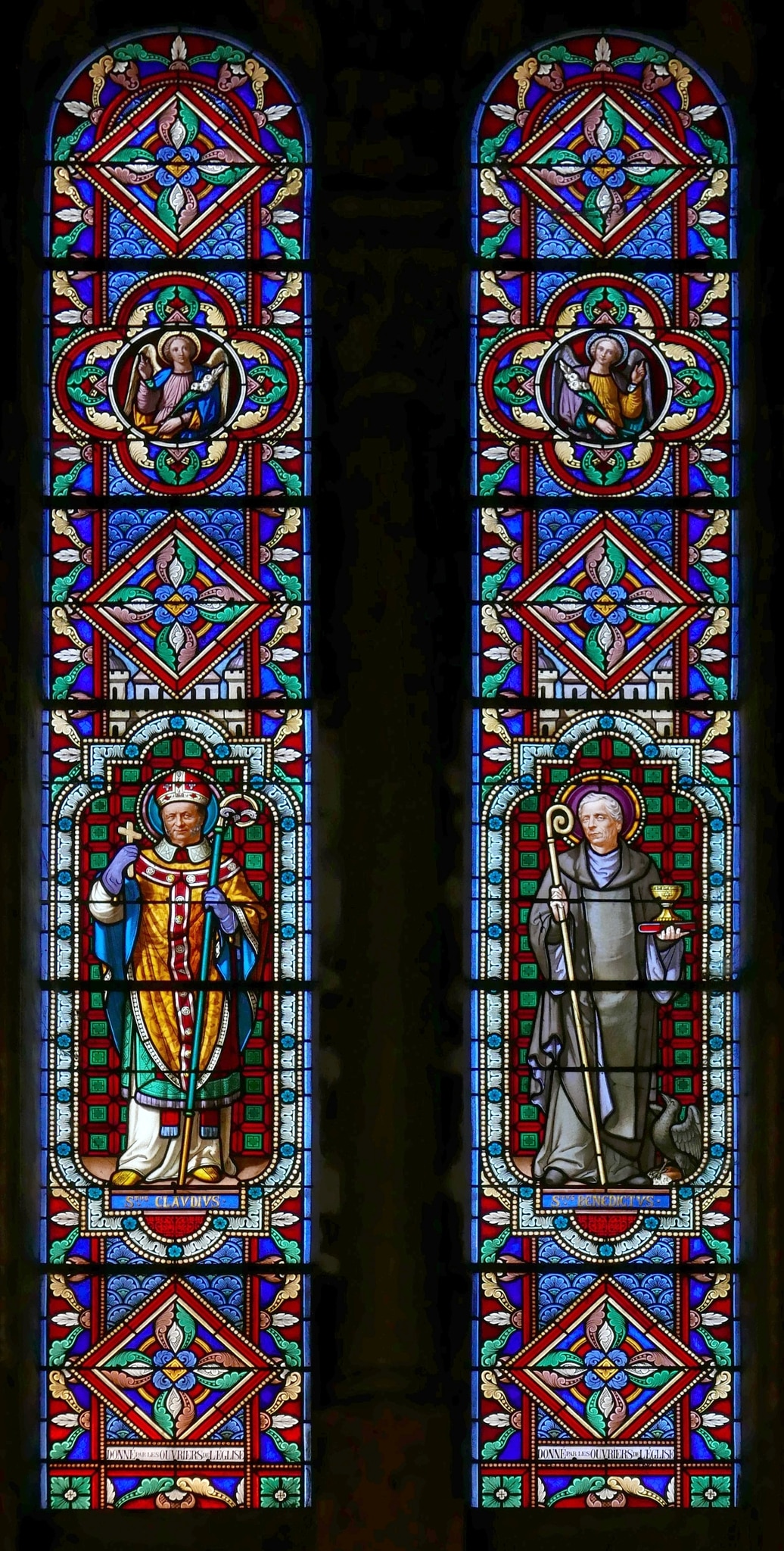 Fenster mit zwei in Rundbogen endenden Lanzetten, die in der unteren Hälfte Darstellungen zweier Heiliger auf grün-rotem Grund zeigen. Links ist Claudius von Condat in reichem Bischofsornat mit Mitra, Krummstab und einem Kreuz in den Händen dargestellt. Rechts ist in einem schlichten schwarzen Mönchsgewand Benedikt von Nursia mit Buch, Kelch und einem Krummstab zu sehen; zu seinen Füssen sitzt ein Rabe mit ausgebreiteten Flügeln. Die beiden Figuren sind von einem hellblauen Rahmen mit Blatt- und Blütenmuster gefasst. Die übrigen Fensterflächen sind mit farbigen geometrischen und architektonischen Motiven und Blattornamenten im Stil der Gotik gestaltet. Im oberen Drittel der Lanzetten je ein Vierpass mit Medaillon und der Halbfigur eines Engels mit Lilie; zuunterst Stifterinschrift.