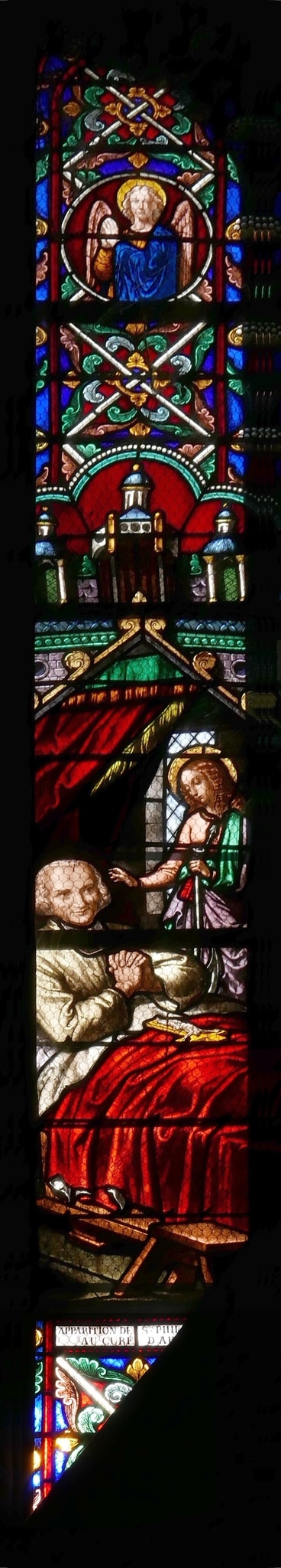 Hohes Rundbogenfenster mit einer Darstellung des kranken Jean-Marie-Baptiste Vianney (genannt Le Curé d’Ars, 1786–1859) in der unteren Hälfte. Während der Priester im Krankenbett betet, vor sich ein Kruzifix, erscheint ihm die heilige Philomena von Rom, um ihm seine Heilung anzukünden. Sie streckt eine Hand zum Kopf des lächelnden Kranken aus, in der anderen hält sie ihr Attribut, einen Anker. Die Darstellung ist von schmalen Säulen und einem Baldachin im Stil der Gotik gefasst. Die übrige Fensterfläche ist mit farbigen geometrischen Motiven und Blattornamenten sowie einem Rahmen mit Blatt- und Blütenmuster gestaltet. Im oberen Drittel zudem Medaillon mit der Halbfigur eines betenden Engels; im untersten Register Inschrift mit Benennung der Bildszene und Stifterinschrift.