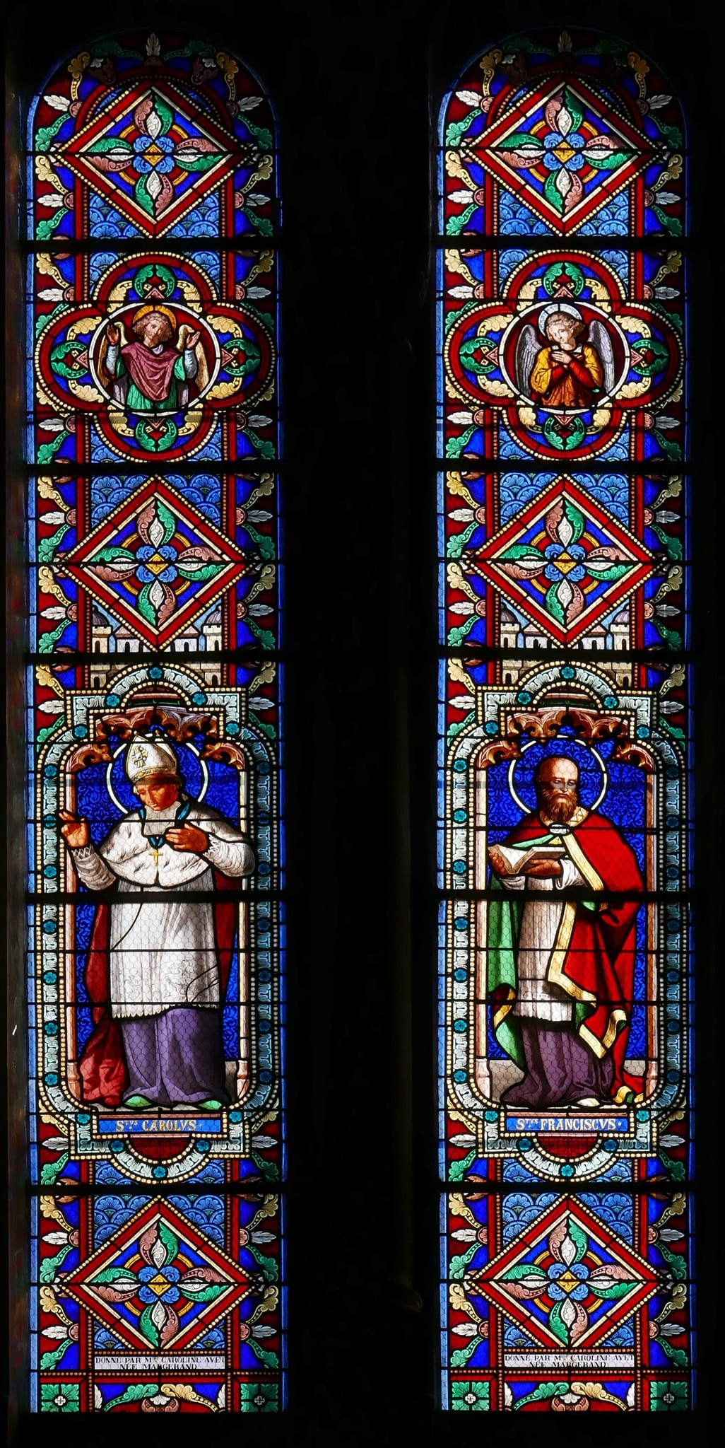 Fenster mit zwei in Rundbogen endenden Lanzetten, die in der unteren Hälfte zwei Heilige als Ganzfiguren auf blauem Grund zeigen. Links ist der heilige Karl Borromäus (1538–1584) als Bischof von Mailand in reichem Ornat und mit rotem Mantel dargestellt, die eine Hand zum Segen erhoben. Rechts ist der heilige Franz von Sales (1567–1622) zu sehen; er trägt ebenfalls einen roten Mantel und hält ein geöffnetes Buch in den Händen. Die beiden Namen der Heiligen finden sich unterhalb der Figuren, die von einem hellblauen Rahmen mit Blatt- und Blütenmuster gefasst sind. Die übrigen Fensterflächen sind mit farbigen geometrischen und architektonischen Motiven und Blattornamenten im Stil der Gotik gestaltet. Im oberen Drittel der Lanzetten je ein Vierpass mit Medaillon und der Halbfigur eines Engels mit Lilien; zuunterst Stifterinschrift.