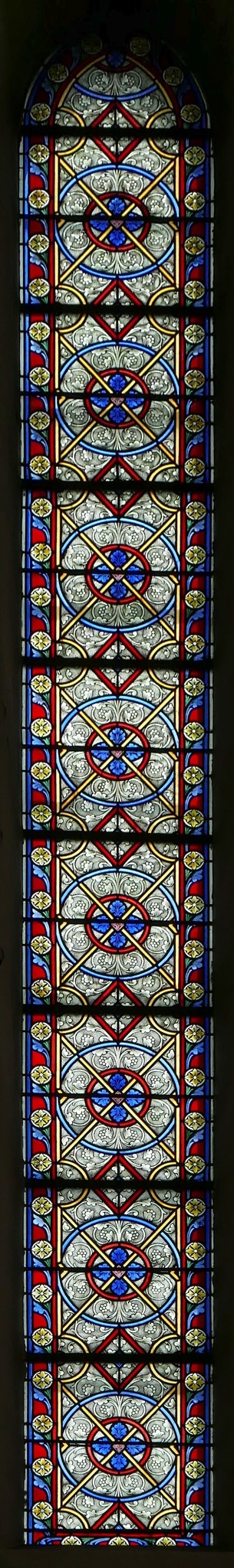Langgezogenes Spitzbogenfenster, das mit sich wiederholenden farbigen geometrischen Motiven (Kreise, diagonale Linien und stehende Vierecke), Grisaillemalerei (Blüten- und Blattranken) und einem farbigen Rahmen mit Blatt- und Blütenmuster gestaltet ist.