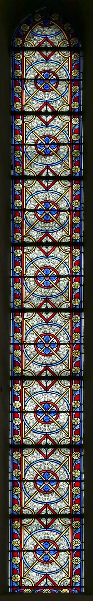 Langgezogenes Spitzbogenfenster, das mit sich wiederholenden farbigen geometrischen Motiven (Kreise, diagonale Linien und stehende Vierecke), Grisaillemalerei (Blüten- und Blattranken) und einem farbigen Rahmen mit Blatt- und Blütenmuster gestaltet ist.