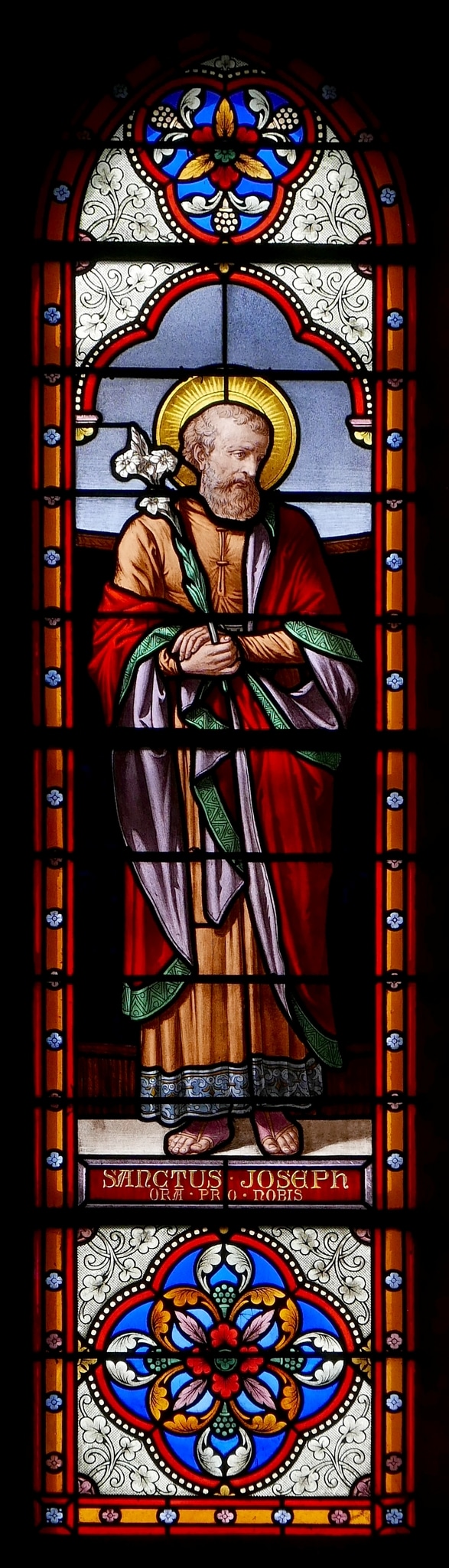 Spitzbogenfenster mit einer Darstellung Josephs im Zentrum. Der in ein braunes Gewand und einen roten Mantel mit lilafarbenem Futter gehüllte Joseph hält eine weisse Lilie in seinen Händen. Die Ganzfigur ist von einem dreilappigen Bogen überfasst. Unterhalb der Darstellung Inschrift. Die übrigen Fensterflächen sind mit Grisaillemalerei (Blattranken), zwei farbigen Medaillons mit Blatt- und Blütenmuster und einem schmalen, blütenbesetzten Rahmen in Rot und Gelb geschmückt.